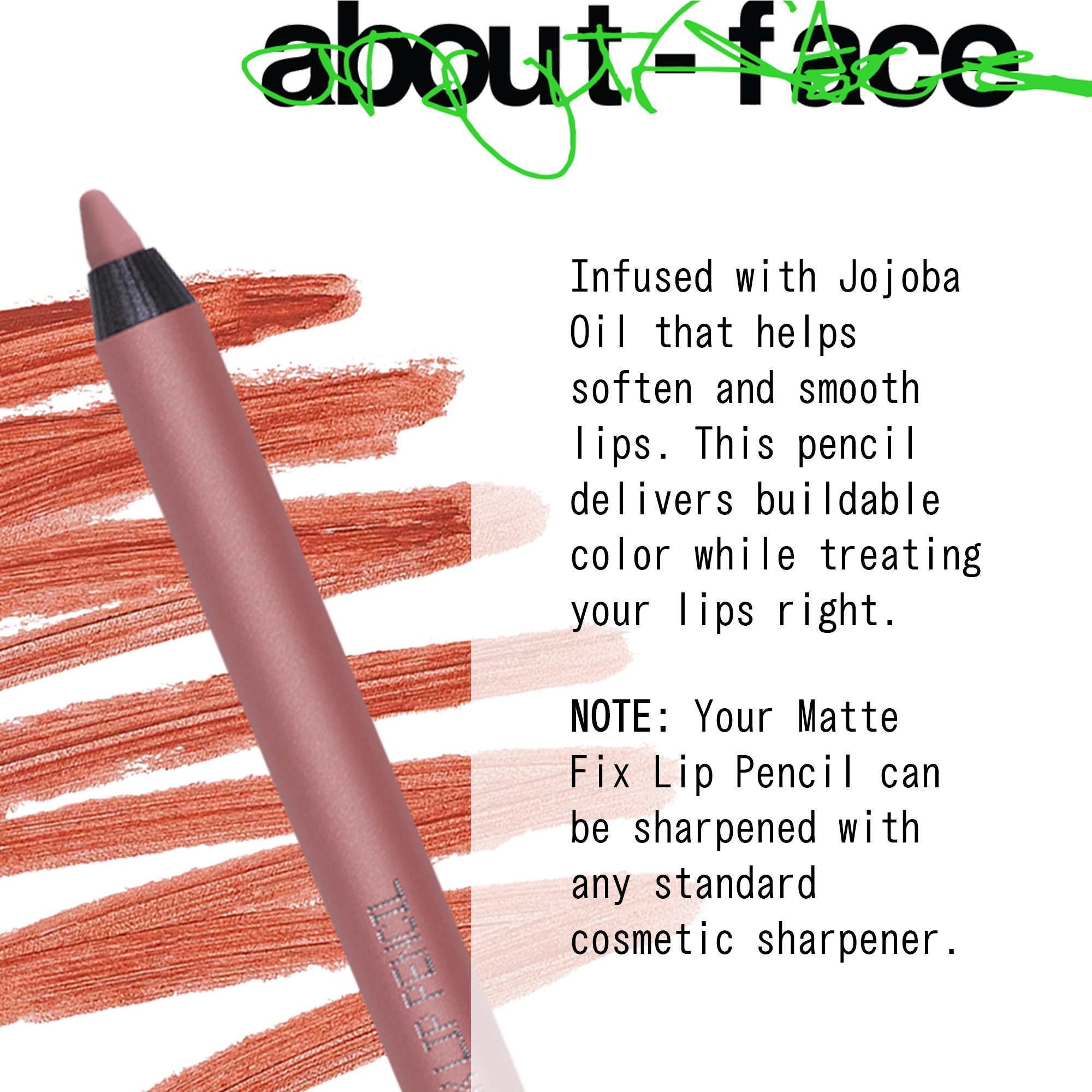 The about-face Matte Fix Lip Pencil is a glide-on matte, creamy liner that defines lips for 7+ hours while delivering bold, buildable color.