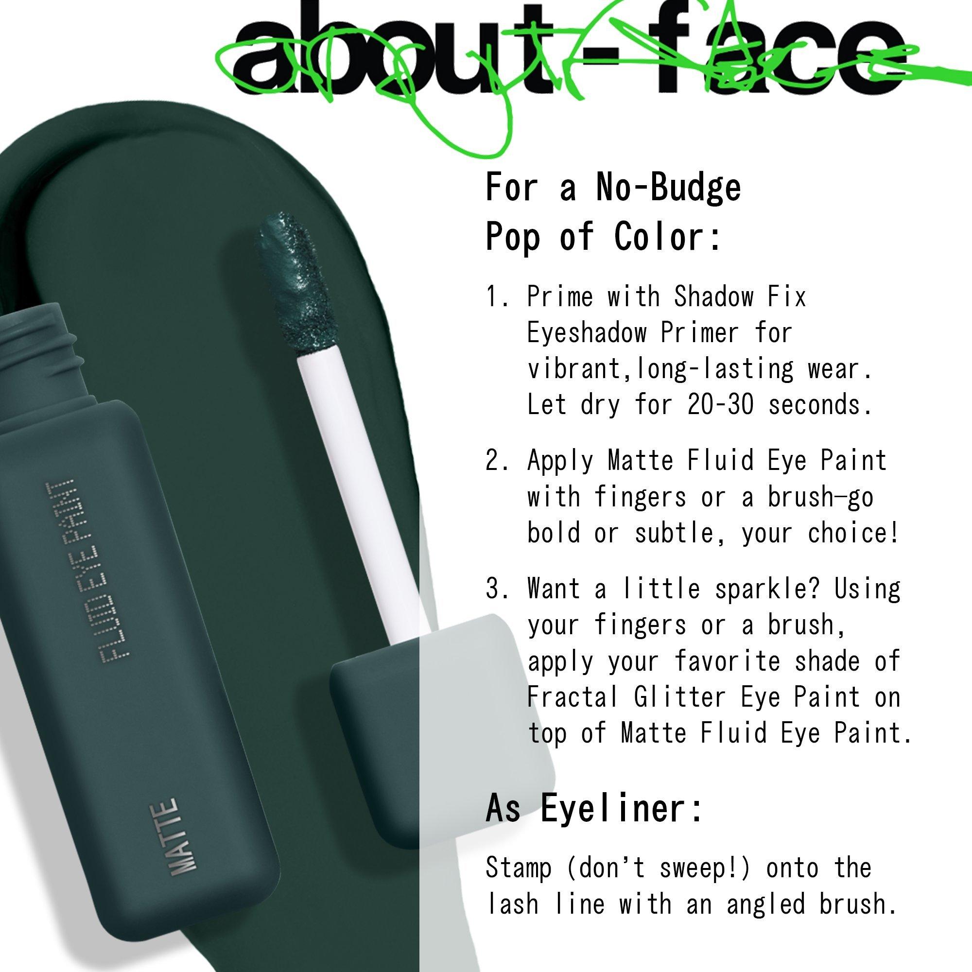 The about-face Matte Fluid Eye Paint is a powerful, one-swipe punch of liquid eye color that delivers bold, buildable pigment.