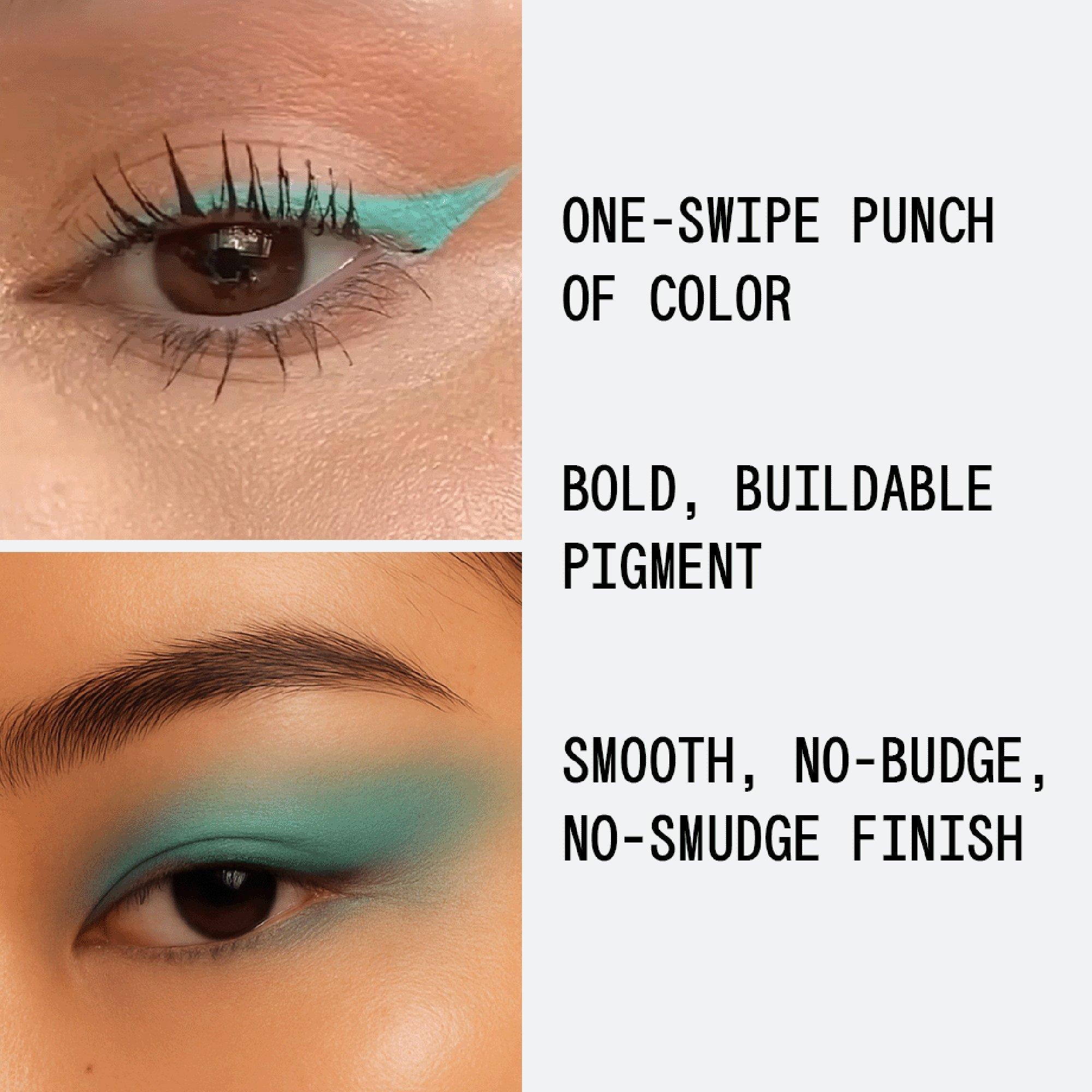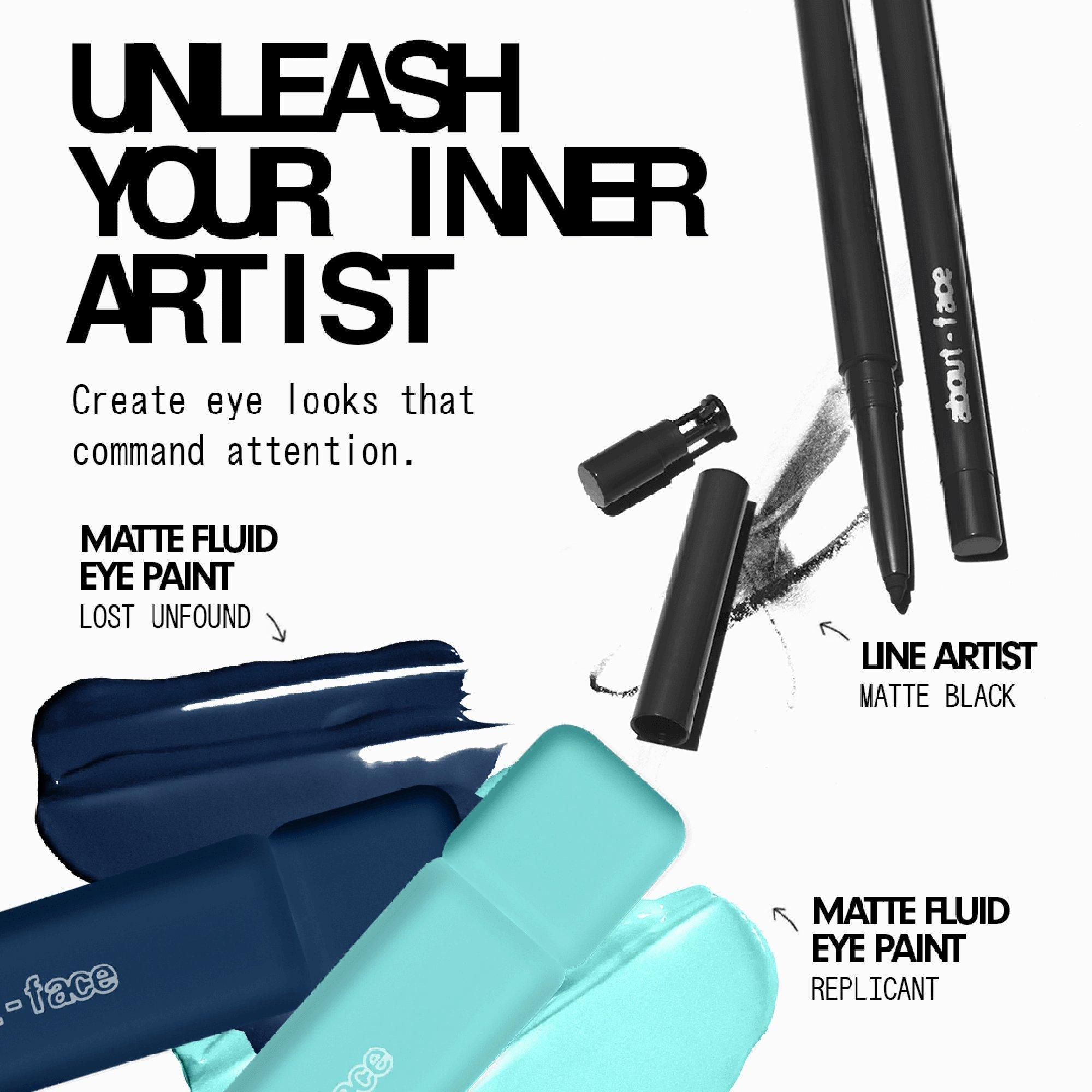 The about-face Matte Fluid Eye Paint is a powerful, one-swipe punch of liquid eye color that delivers bold, buildable pigment.