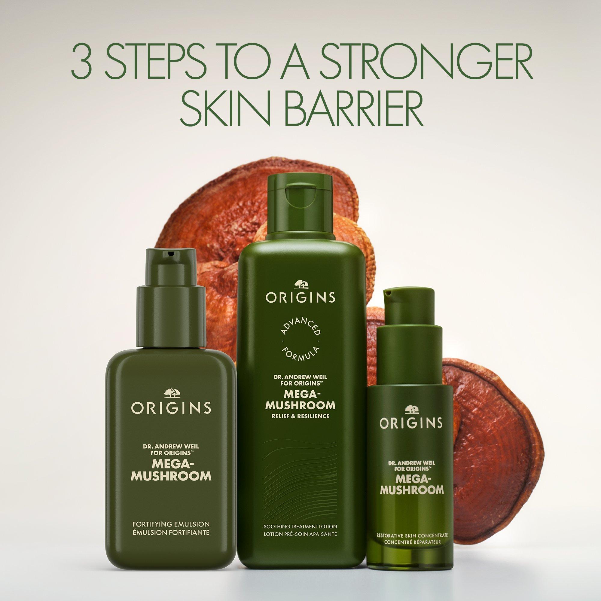 The Origins Mega Mushroom Restorative Skin Concentrate rapidly soothes visible redness and helps replenish and repair a compromised skin barrier. It provides visibly sensitized skin with soothing relief and healing hydration. Ideal for everyday and extreme irritation such as a derm procedure.