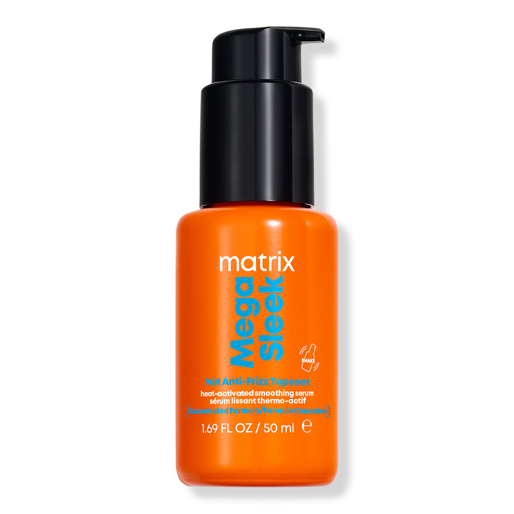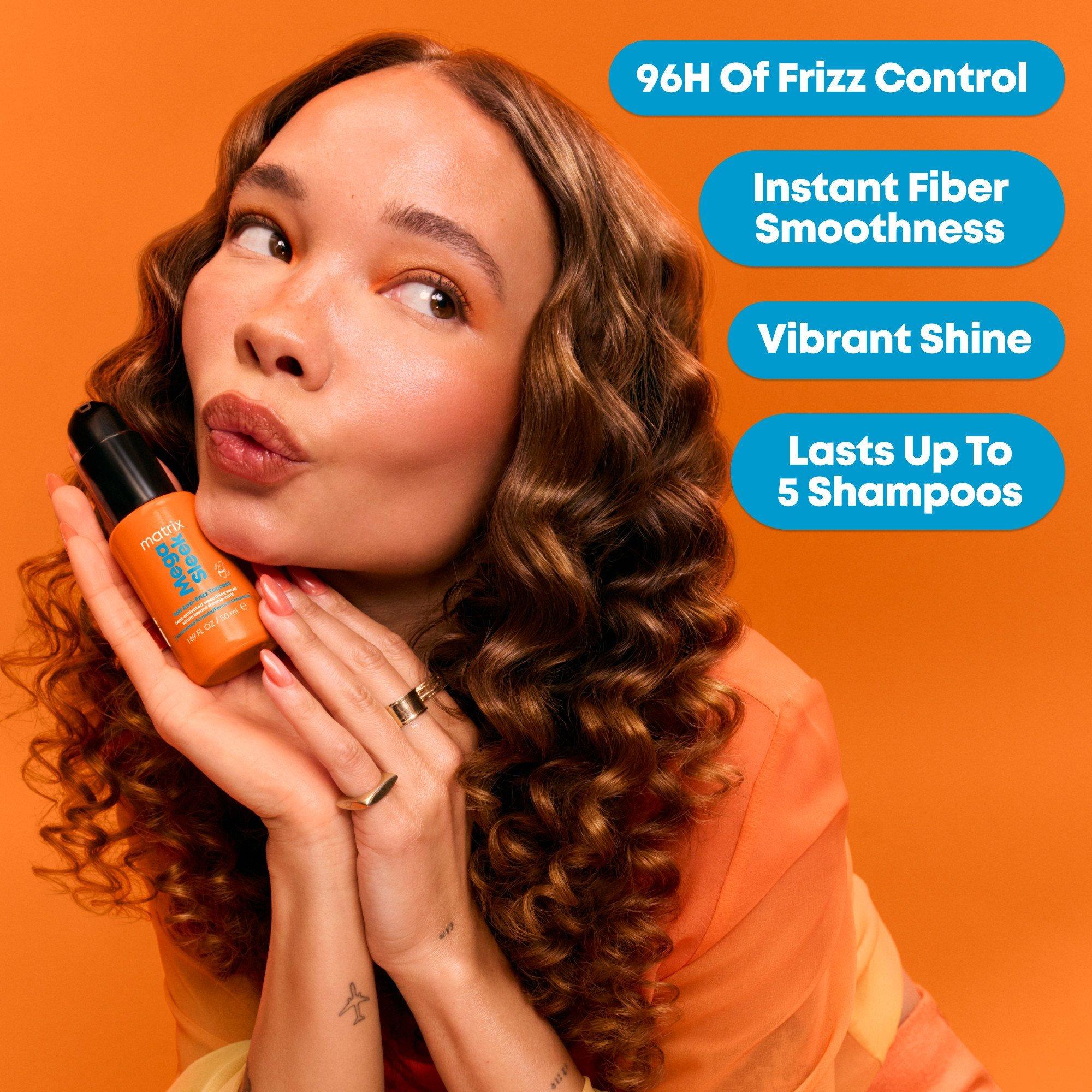 Matrix Mega Sleek Anti-Frizz Topcoat Hair Serum and heat protectant defeats frizz for 96 hours with a heat-activated hydrophobic barrier. This leave in treatment seals hair to defy humidity and provides frizz-prone, vibrant hair shine.