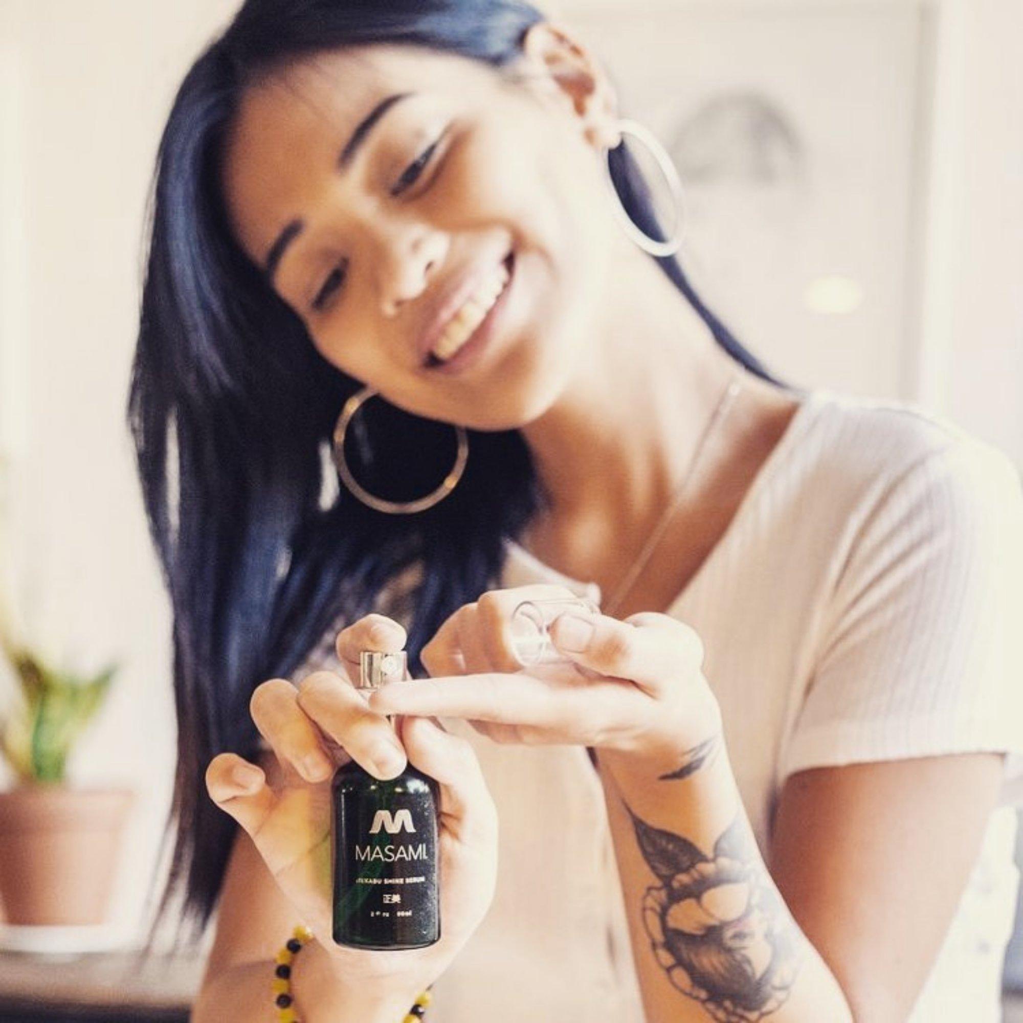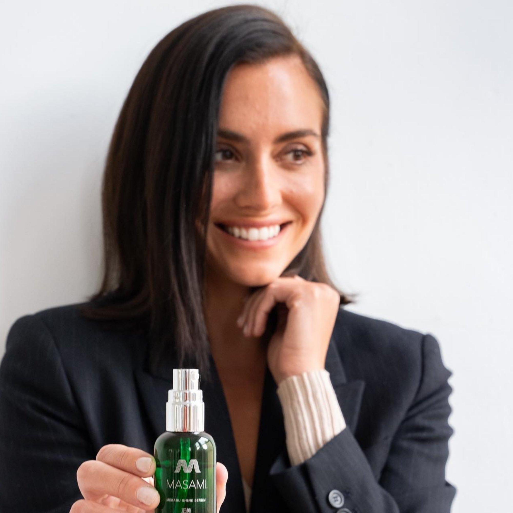 MASAMI's award winning shine serum smooths unruly hair, tames frizz and adds gloss and shine. No mineral oil to weigh hair down.