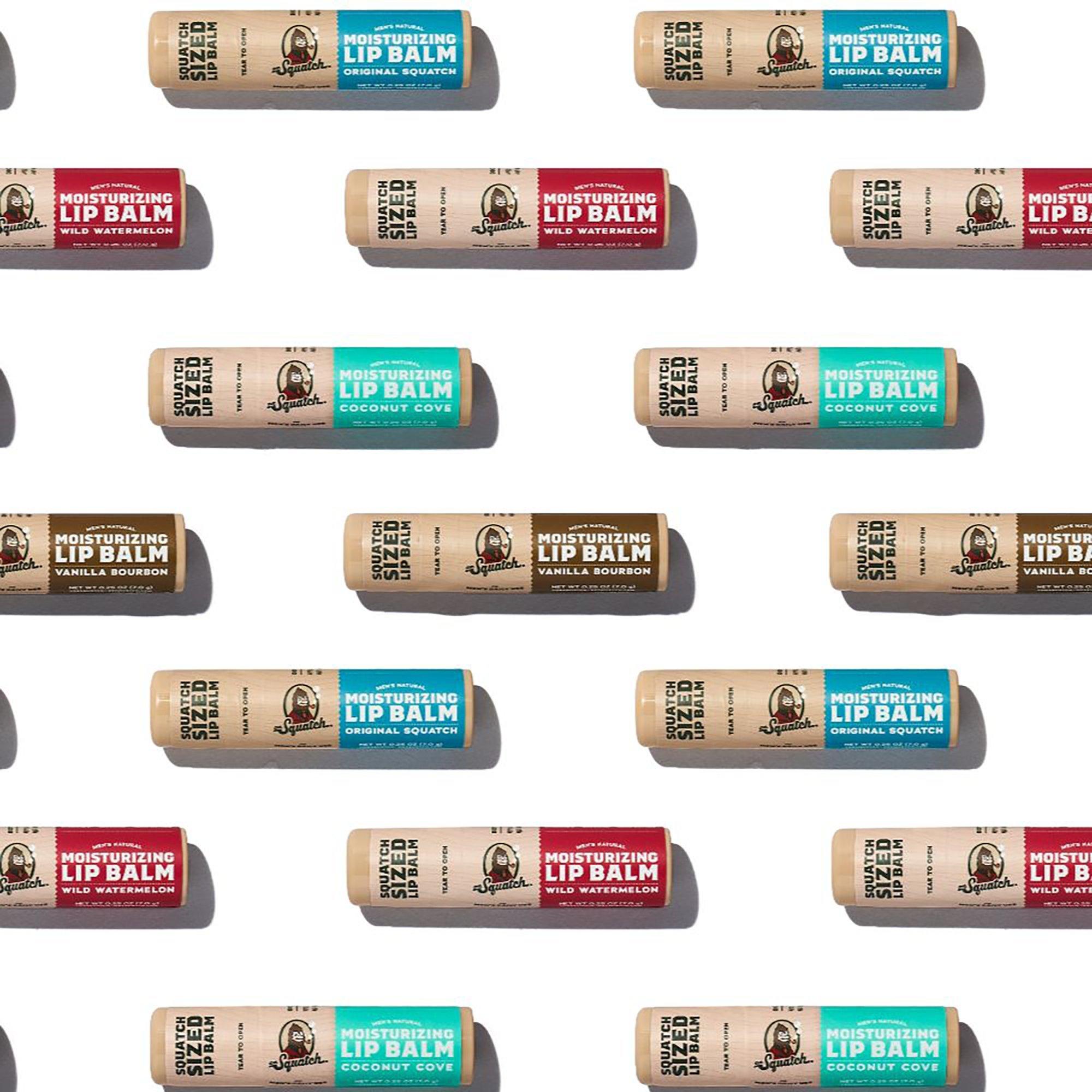 Go big with Dr. Squatch natural, Squatch-sized Lip Balm - 65% larger than standard sticks. Matte, shine-free, and boldly flavored. Made with Vitamin E, Shea Butter, and Beeswax to keep lips smooth, moisturized, and never dull.