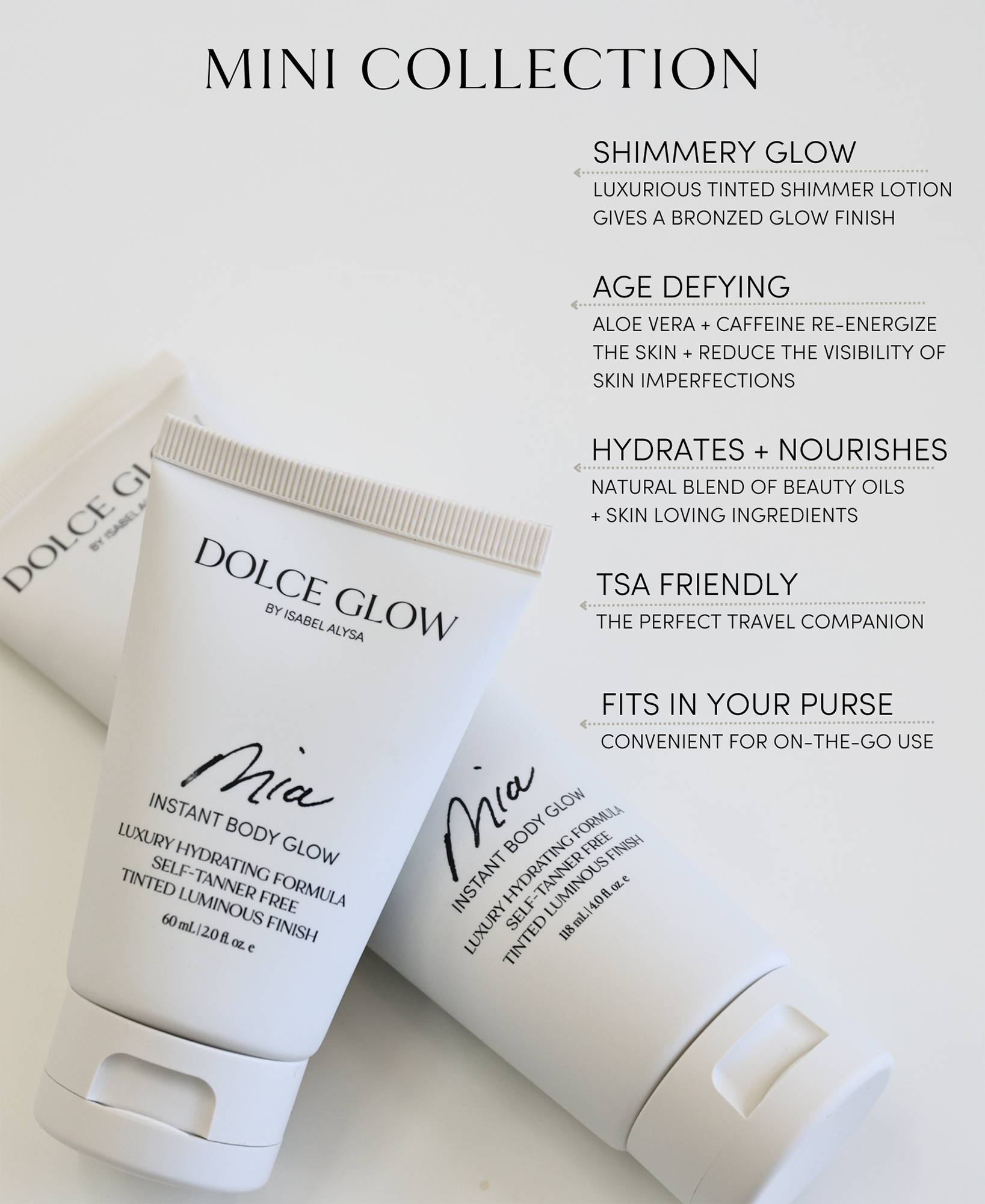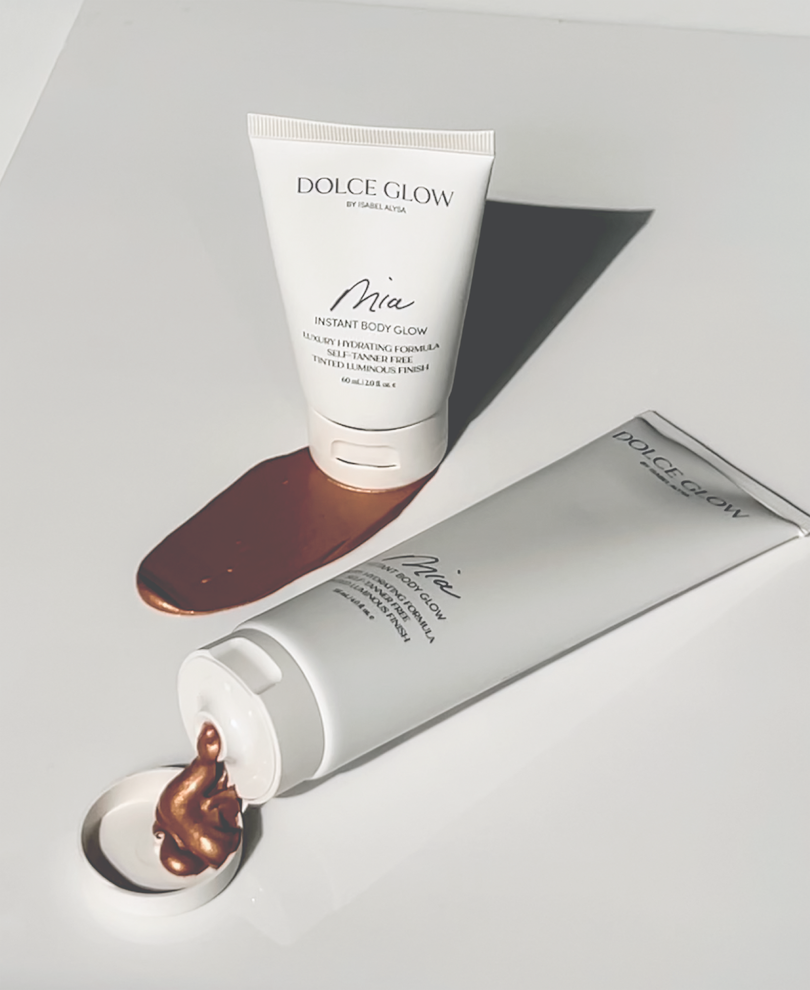 Dolce Glow Mia Instant Body Glow is a luxurious hydrating tinted lotion bronzer made to top off your natural-looking glow without any downtime.
