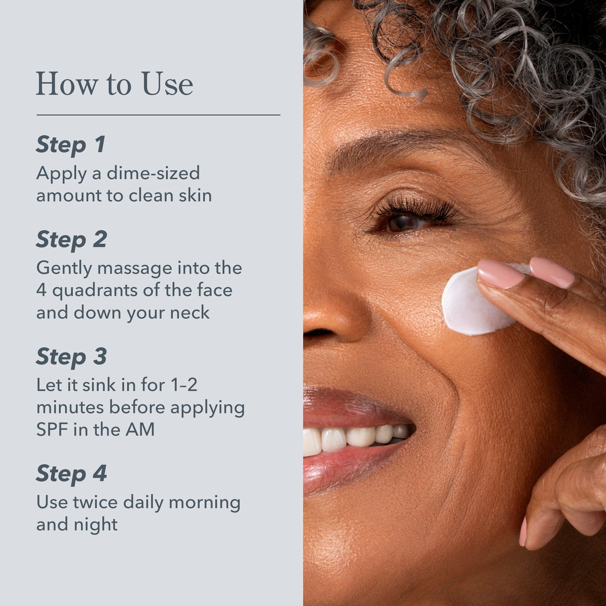 Apply a dime-sized amount to clean skin. Gently massage into the four quadrants of the face and down the neck until absorbed. For best results, use twice daily, morning and night after cleansing. In the daytime, follow with SPF.