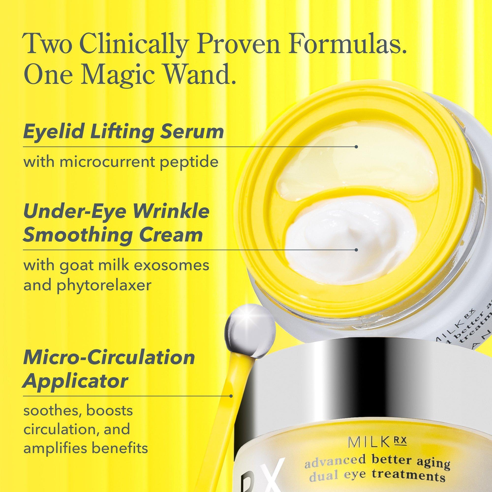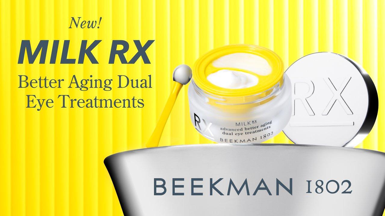 Beekman 1802 Milk RX Better Aging Dual Eye Treatments features an under-eye wrinkle-smoothing cream and an eyelid lifting serum for full circle eye repair.