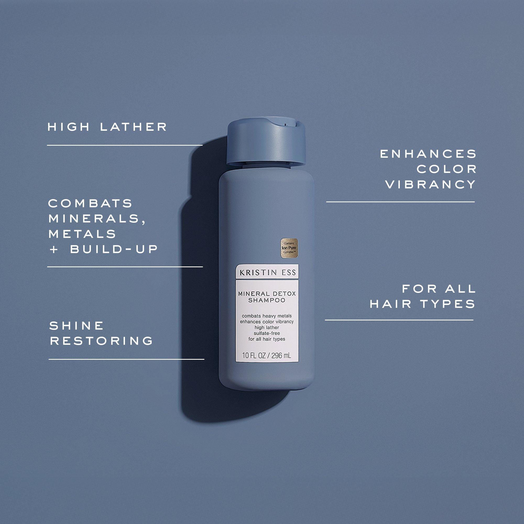 The Kristin Ess Hair Mineral Detox Shampoo with Ion Pure Complex gently removes build-up and heavy metals for shinier, more vibrant, and weightless hair.
