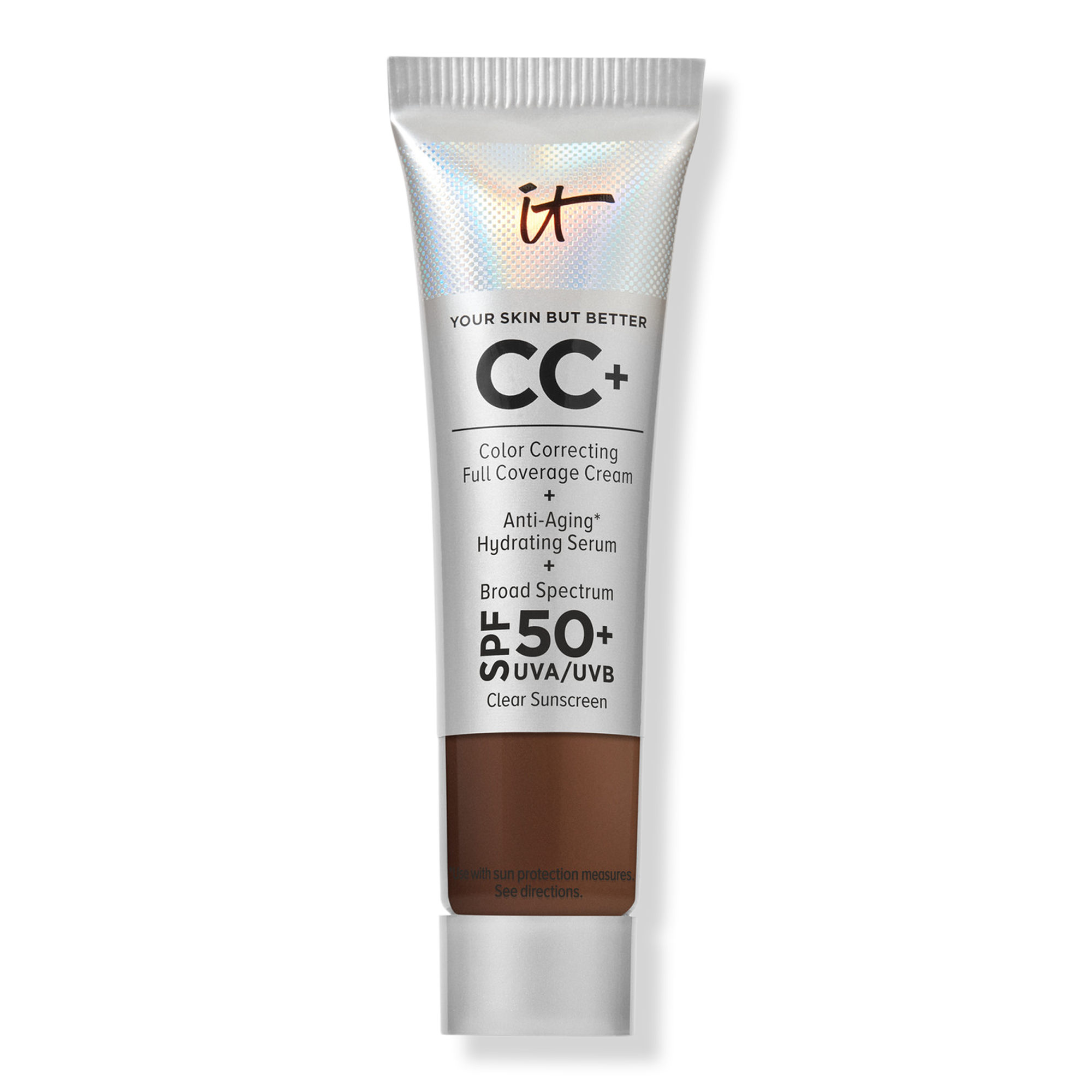 Apply 1-2 pumps of CC+ Cream with SPF 50+ to clean skin using IT Brushes For ULTA Airbrush Spatula Brush #117 or your favorite foundation brush. Can be used as your moisturizer, anti-aging serum, concealer, foundation and sunscreen, based on your coverage needs.