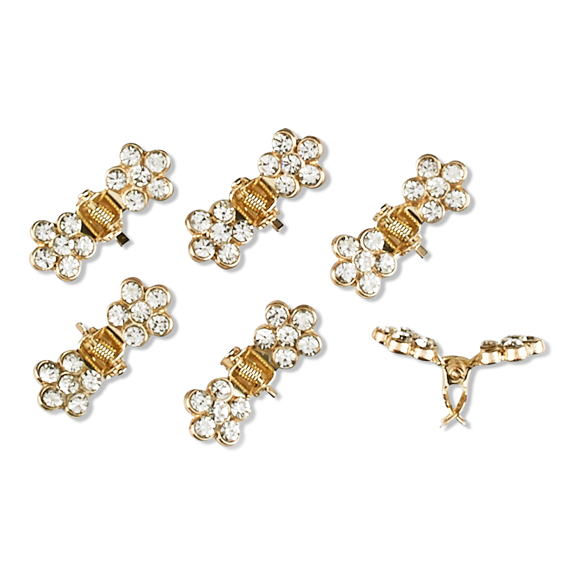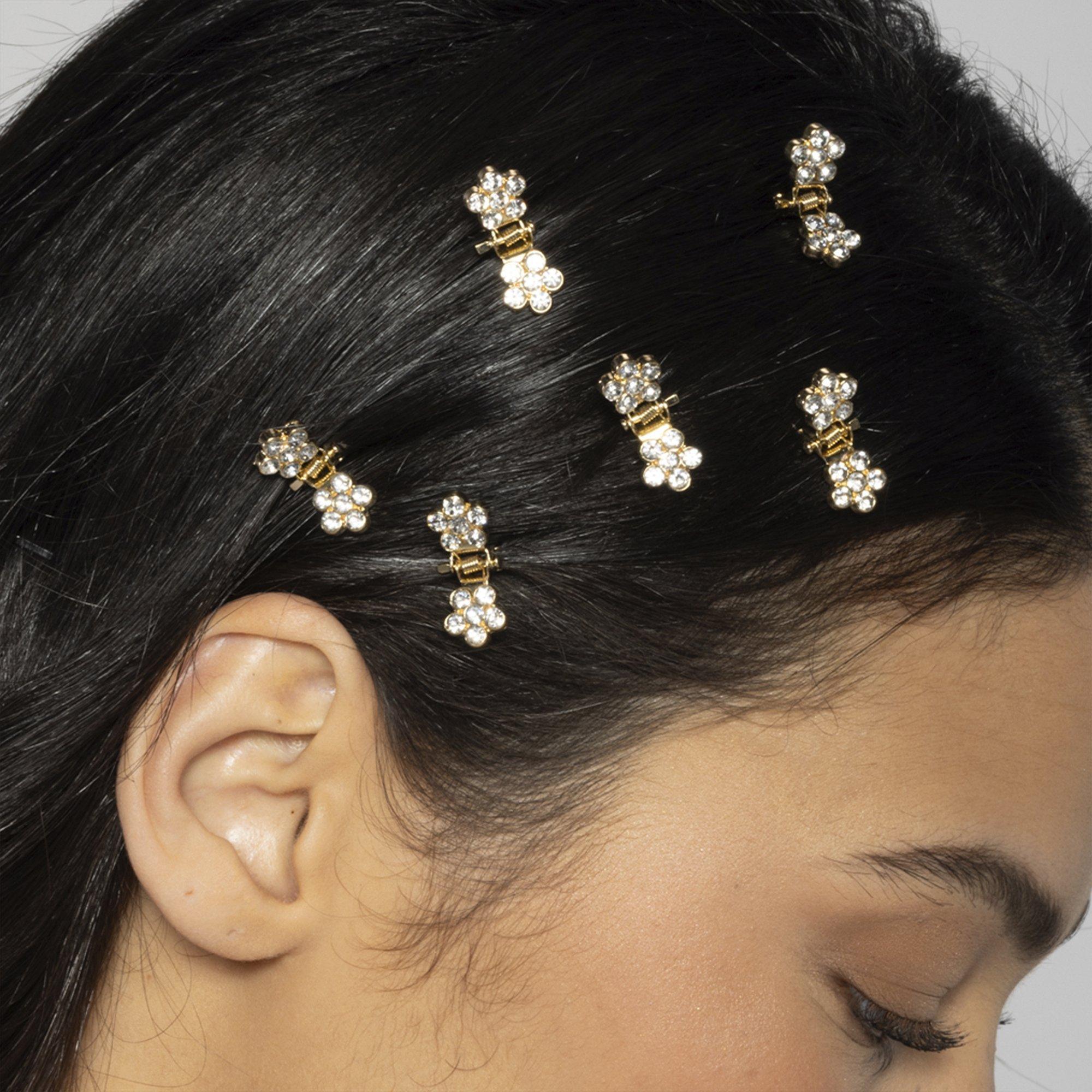 Elevate your look with the easy elegance of Conair Mini Claw Clips. 6 crystal flowers set on gold-tone clips that stay firmly in place without pulling.