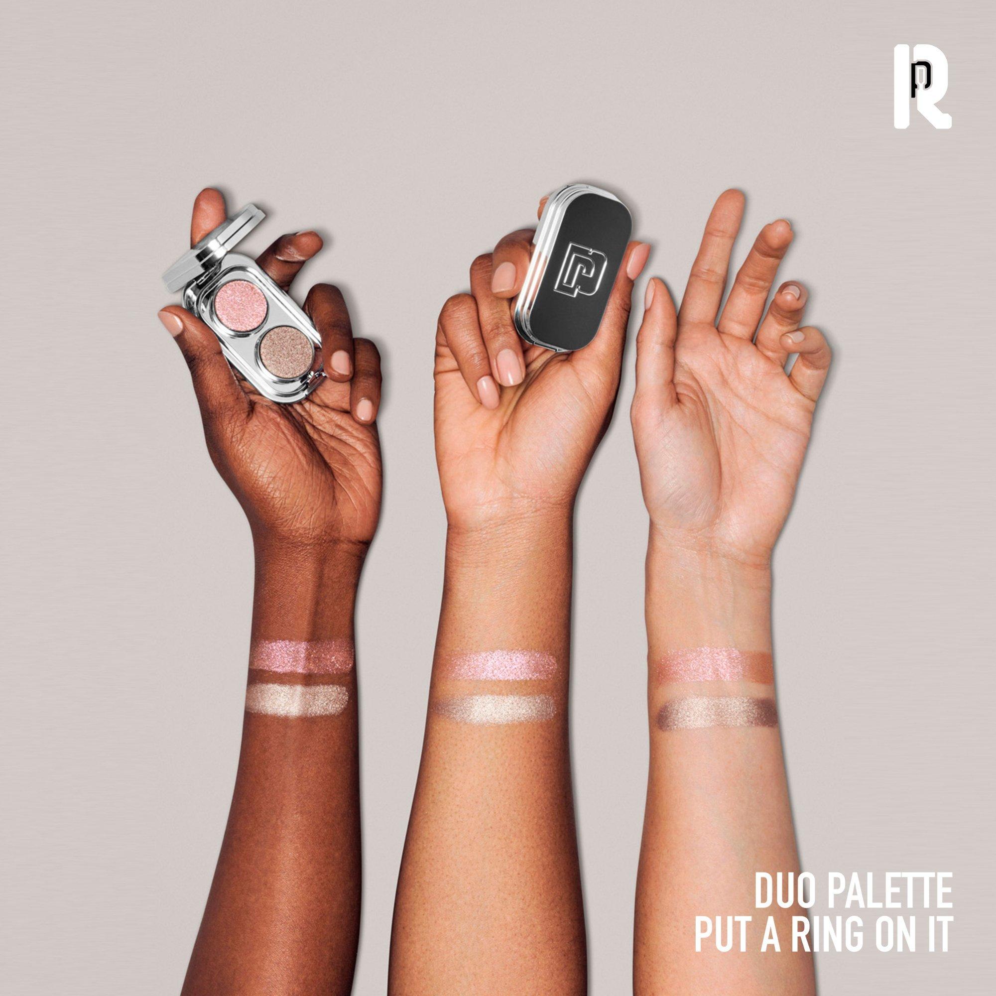 Made to play with colors, the Mini Eyeshadow Palette Duo by Rabanne reinvents the powder experience with multi-finish and multi-sensorially duo eyeshadows, highly pigmented in one-stroke and four second skin feeling textures: matte leather, metal foil, sparkling luster & gloss vinyl.