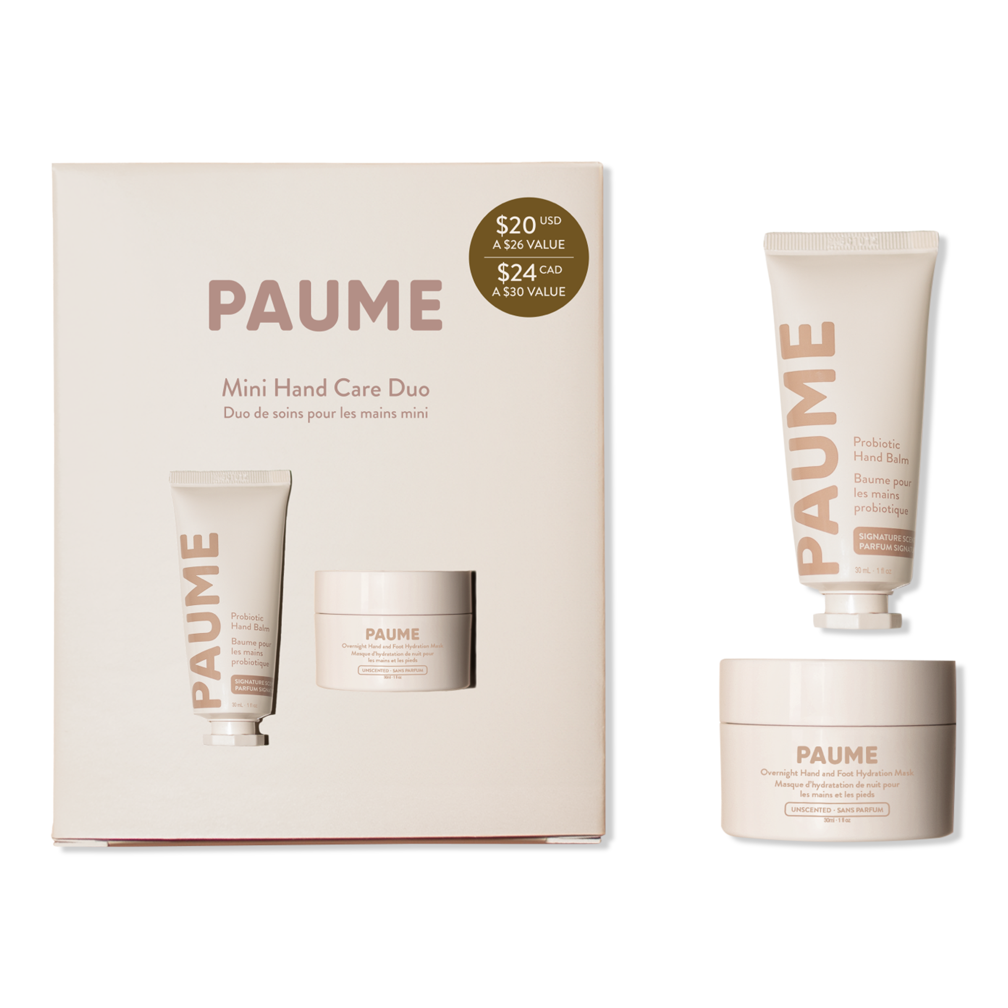 The PAUME Mini Hand Care Duo includes the Probiotic Hand Balm and Overnight Hand and Foot Hydration Mask in travel-friendly sizes. Nourish, hydrate, and restore hands with this perfect gift or on-the-go set.
