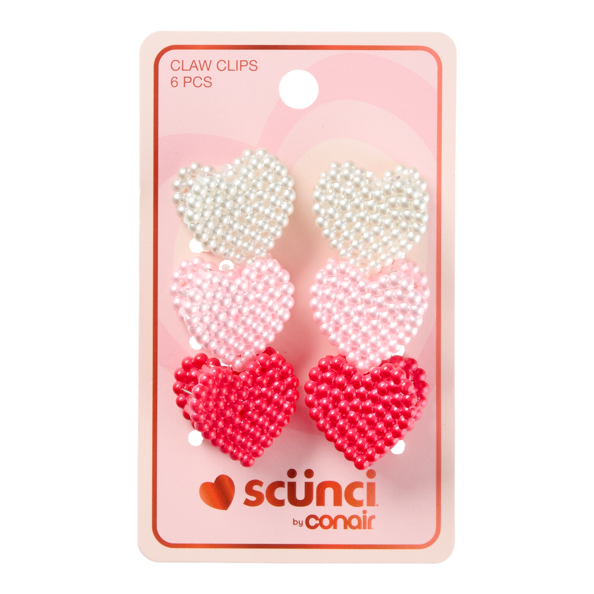 This 6 pack of Mini Heart Pearl Claw Clips from scünci® by Conair® are perfect for a gentle hold, subtle shine, and keeping little pieces in place.