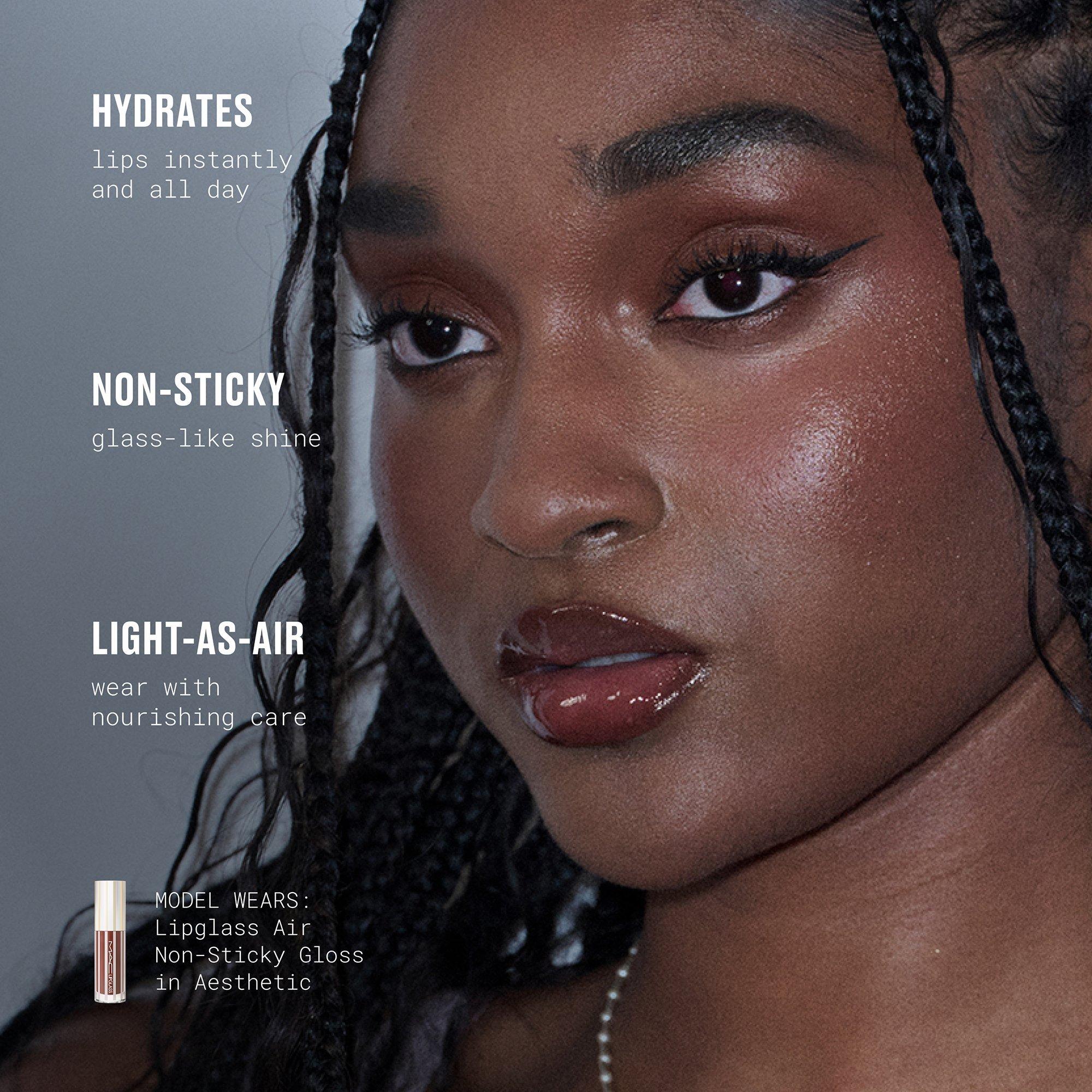 Shines like glass. Feels like air. That high-shine look is so low maintenance with this MAC non-sticky, hydrating and addictive MAC Lipglass Air Lipgloss that delivers light-as-air wear and next-level nourishing care. Now in a mini.