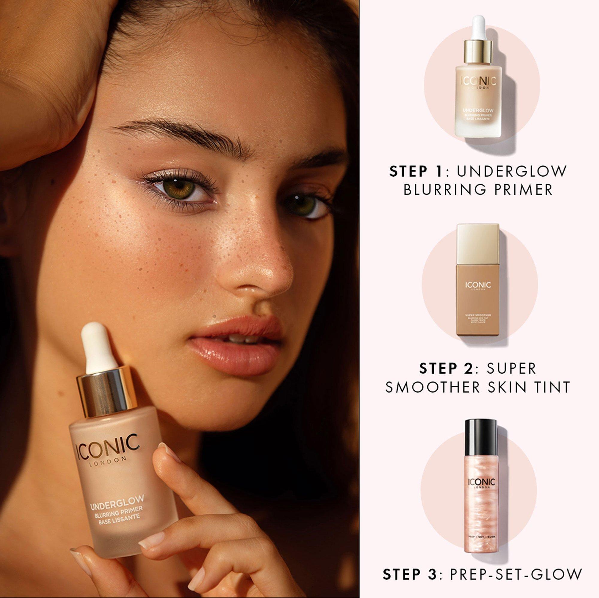 After moisturizing, shake the bottle well and use the ICONIC dropper to apply 2-3 drops of makeup primer all over the face -- focusing on any areas that are often prone to excess shine. Use your fingertips (or your favorite complexion brush) to blend the refreshing formula into your skin. Et voilà -- skin is left blurred, radiant and perfected -- ready for the rest of your glam routine. For best results, use together with Super Smoother Blurring Skin Tint (sold separately). Together these base beauties are the dream duo for that flawless, ultra-natural looking finish that really does glow from within.