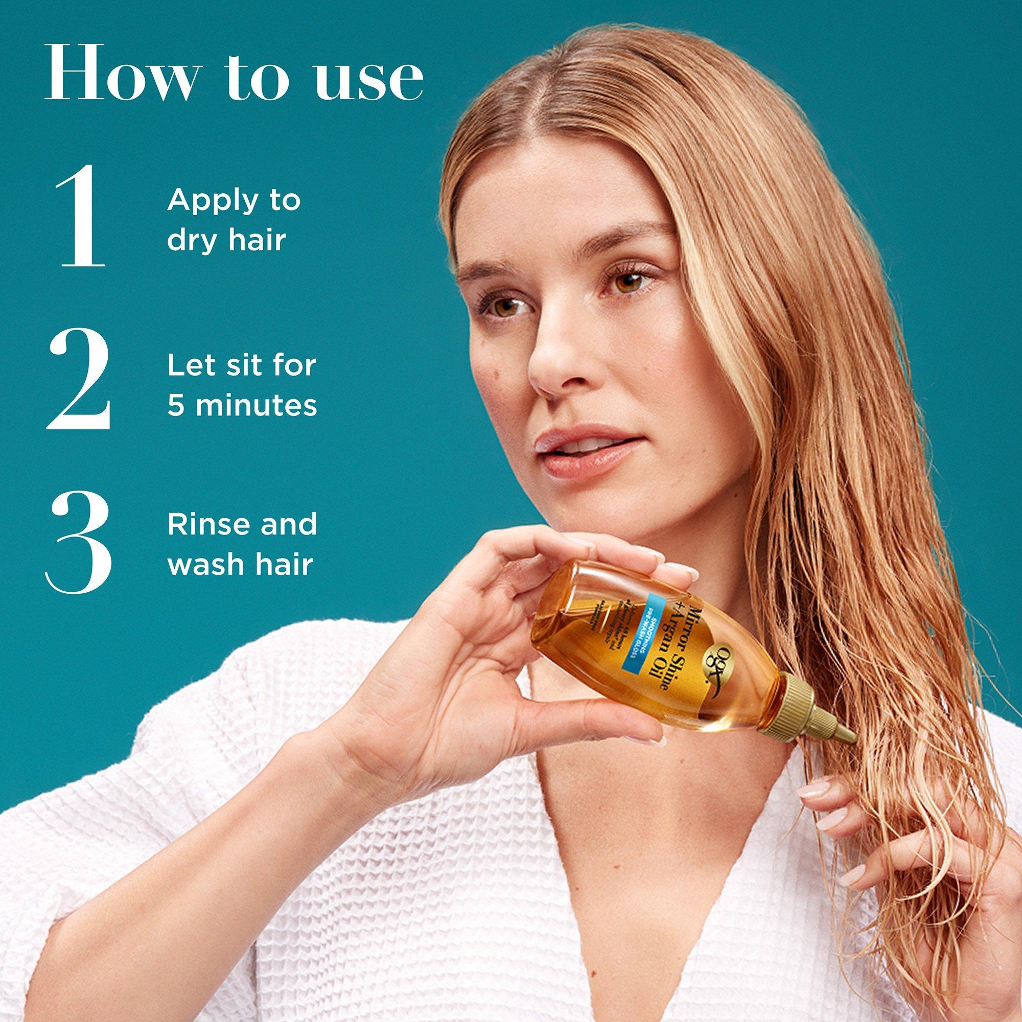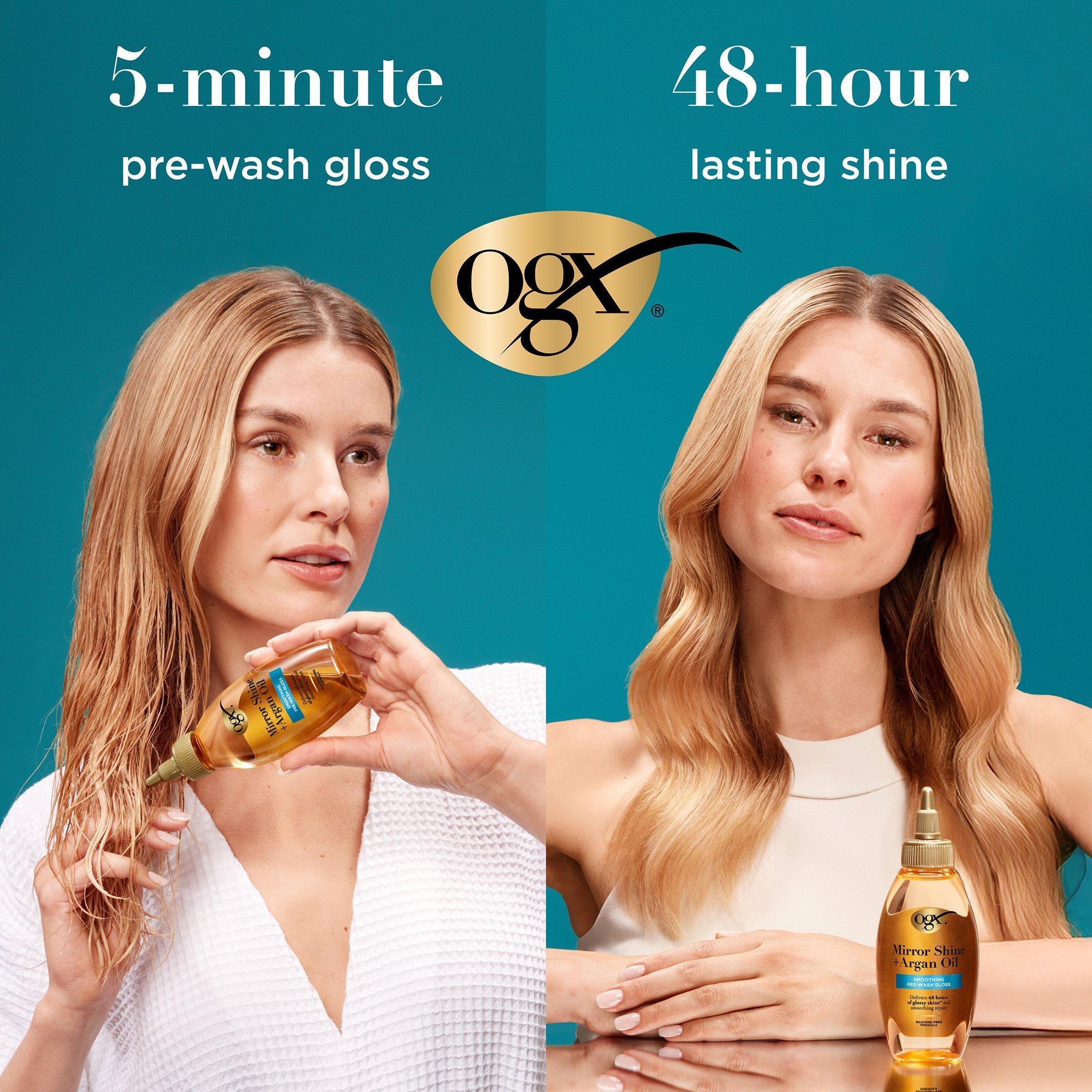 OGX Mirror Shine + Argan Oil Smoothing Pre-Wash Hair Gloss treatment with argan oil smooths and repairs dry, damaged hair for 48 hours of glossy shine* and up to 40% fewer split ends*.
