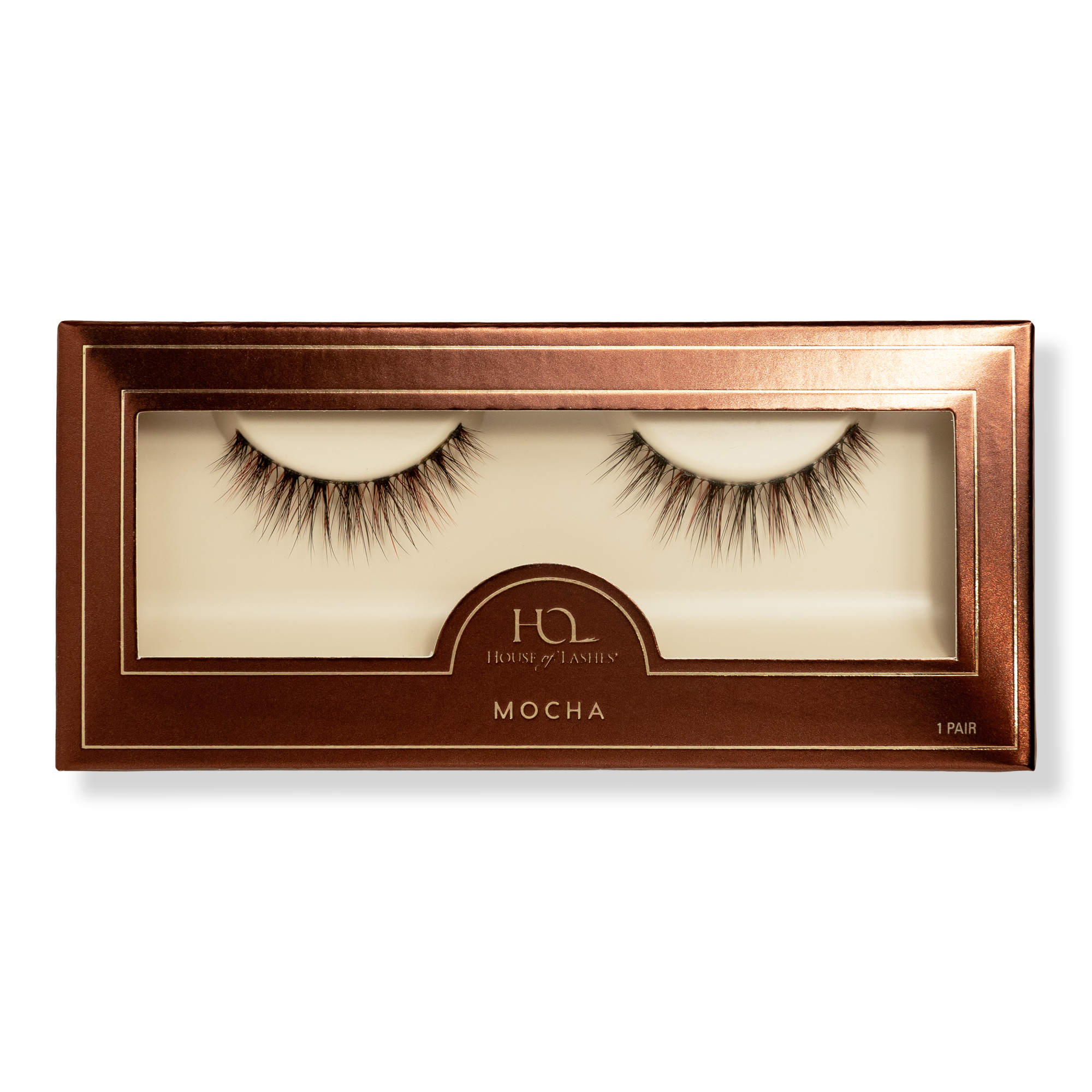 House of Lashes Mocha Natural Volume Faux Silk False Eyelashes is a blend of black, brown, and red wine fibers woven on an invisible band that disappears into the lash line. Delicate clusters with a soft rounded silhouette create soft volume.