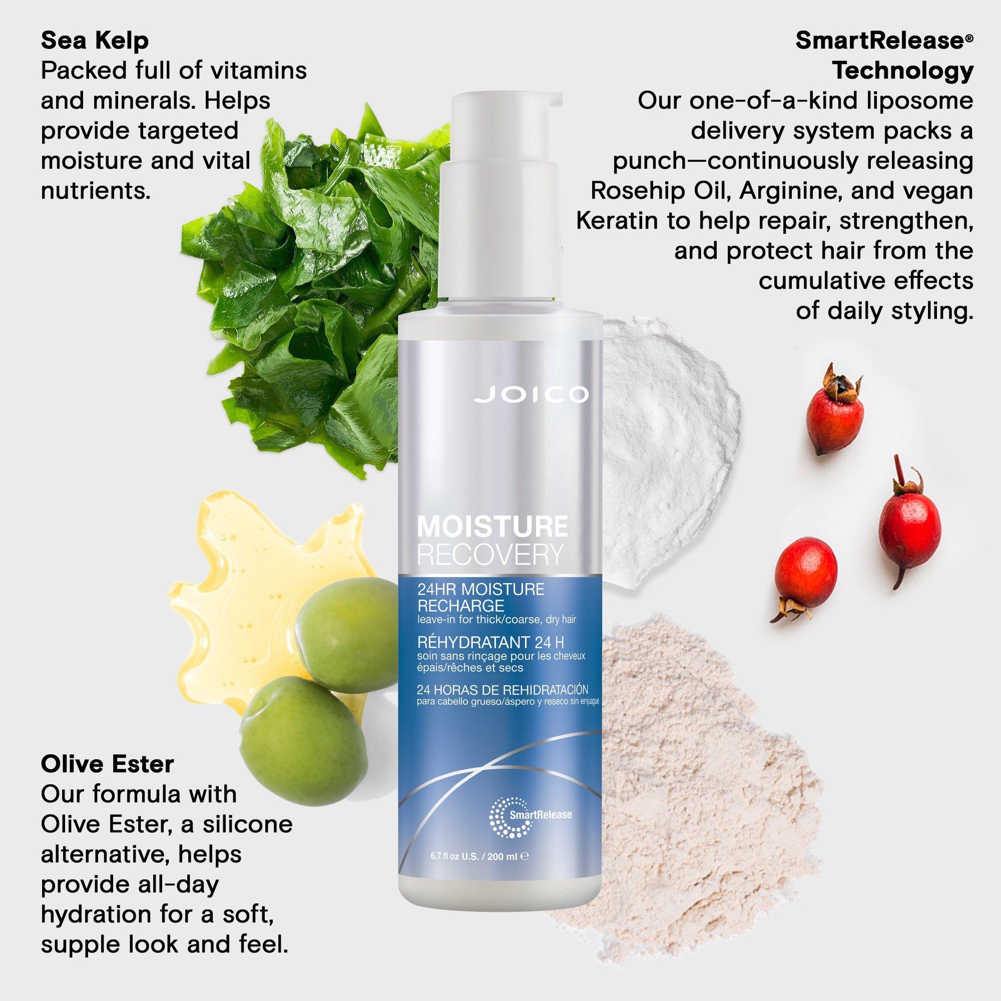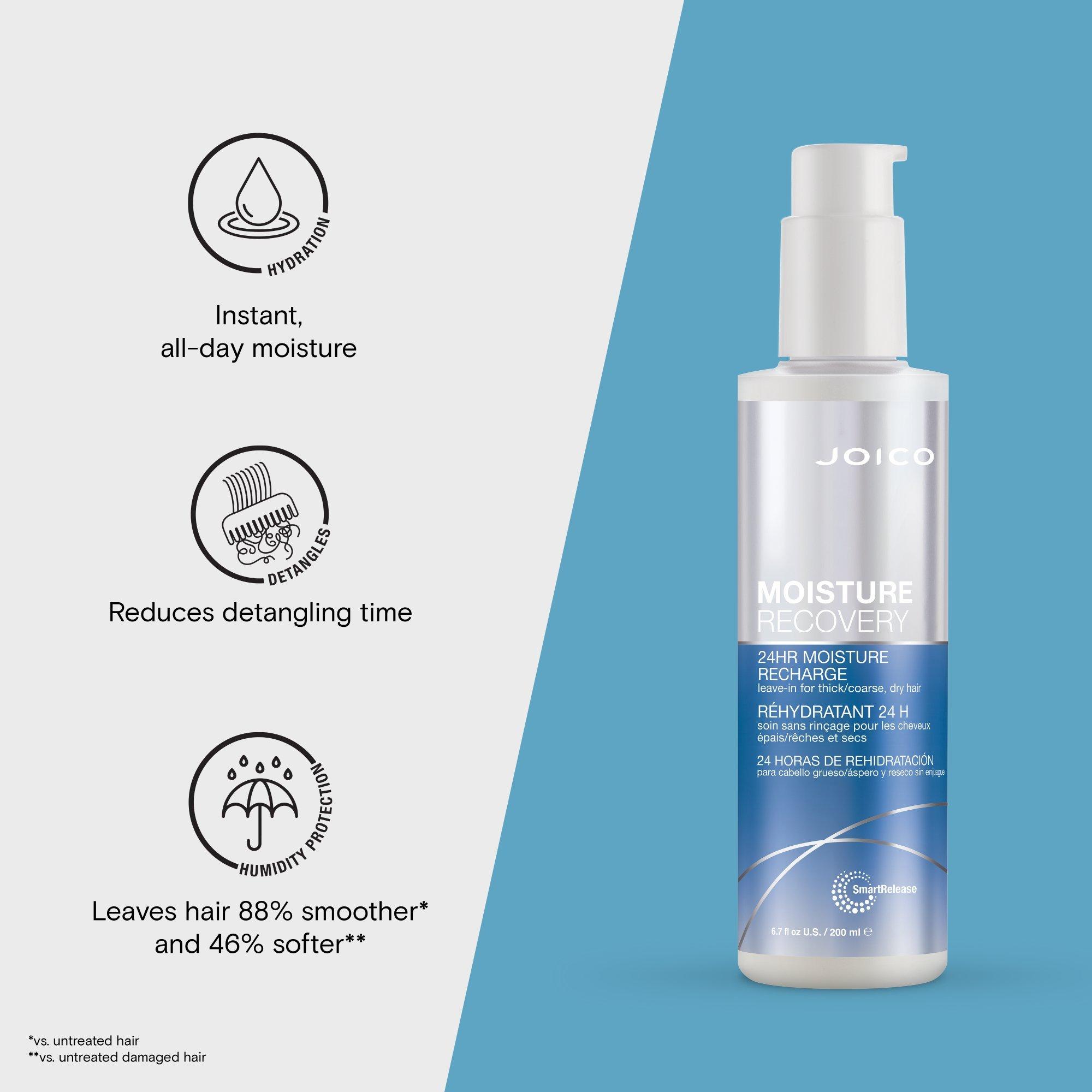 When thick, coarse, dehydrated hair needs an extra boost, Joico's 24Hr Moisture Recharge Leave-In dives deep to deliver all-day moisture.