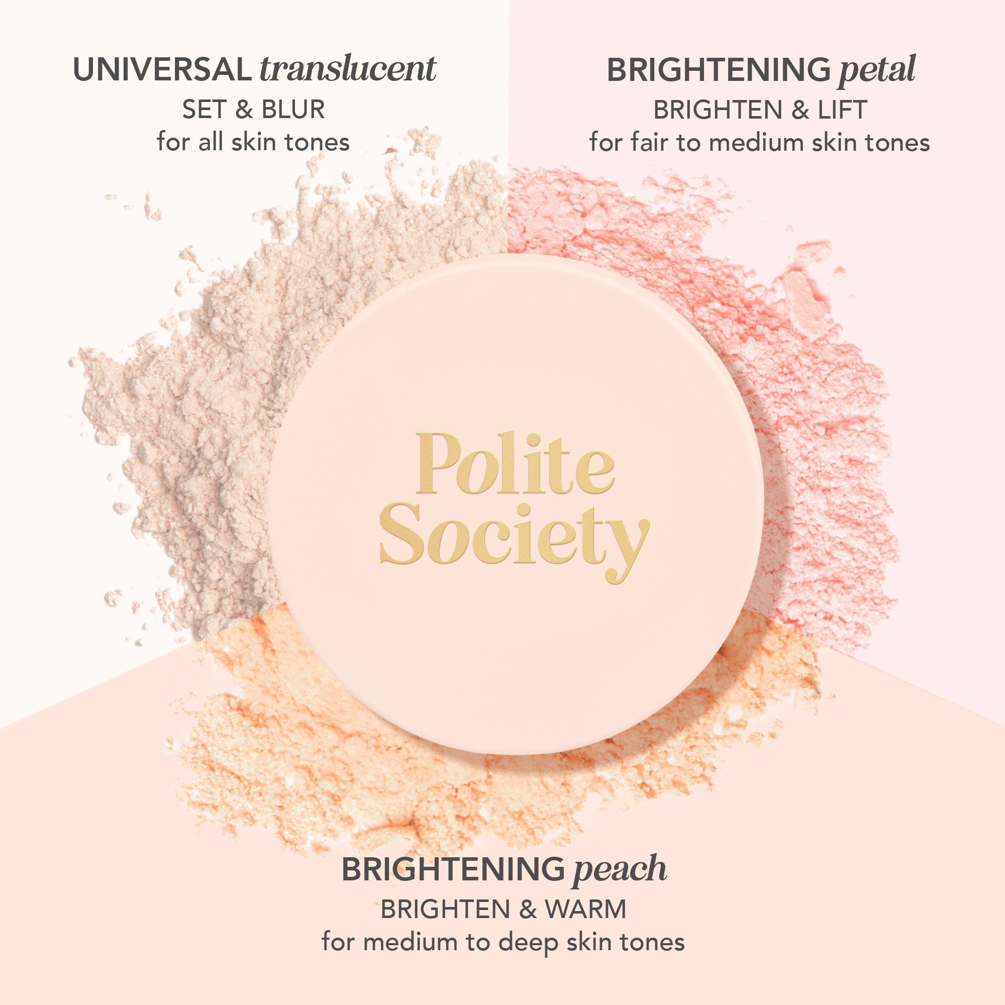 Polite Society More Than A Pretty Powder is a talc-free weightless, blurring, micro-fine setting powder that minimizes pores, controls oil and shine, and prolongs makeup wear.