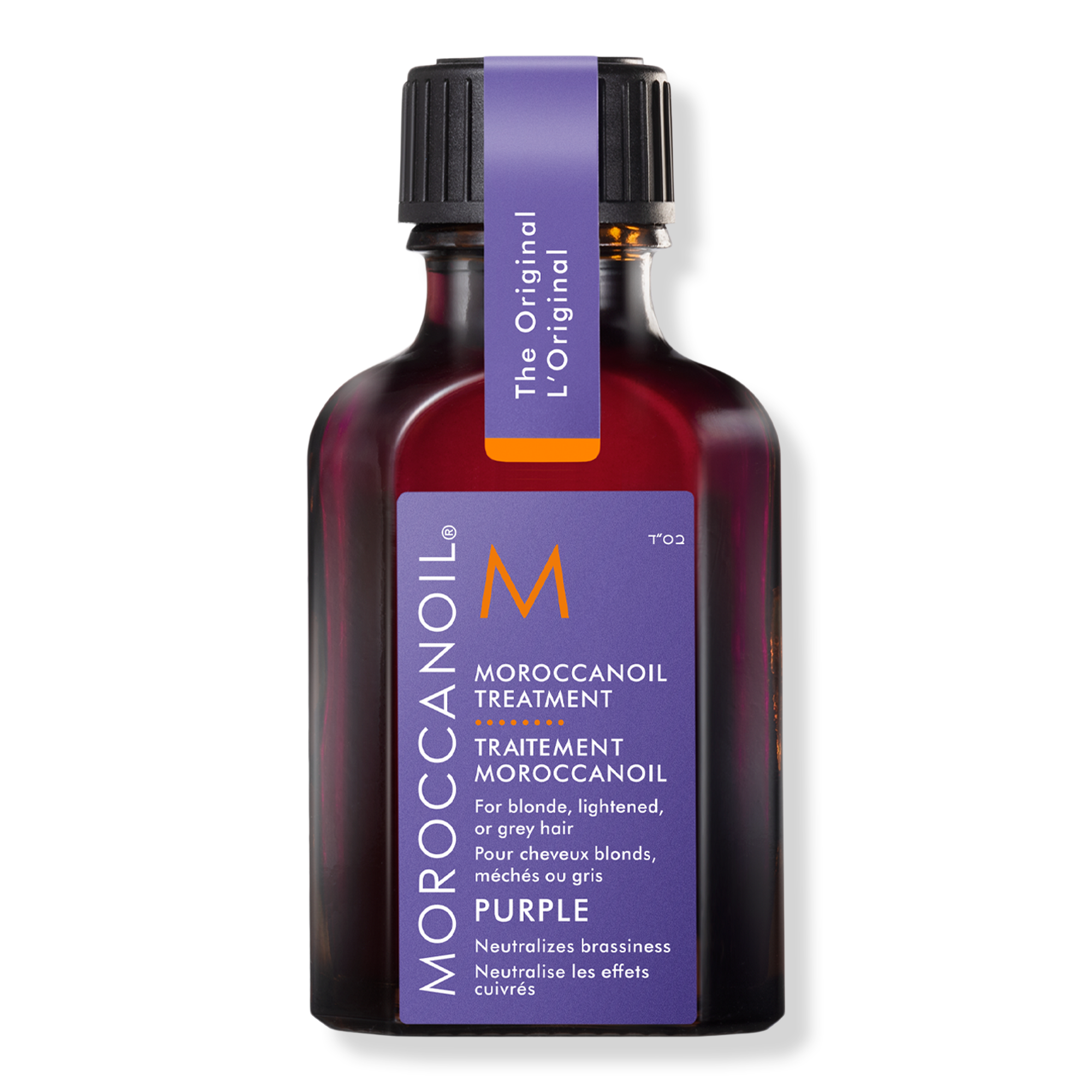Moroccanoil Treatment Purple is a tone-correcting hair oil to boost shine, smooth frizz, and detangle while gradually neutralizing brassiness in blonde, lightened, and grey hair.