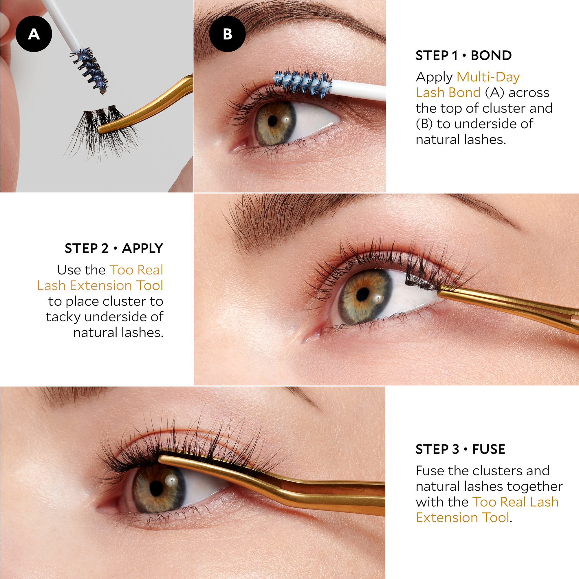 Step 1: Apply Multi-Day Lash Bond (A) across the top of lash cluster and (B) to underside of natural lashes, ensuring not to touch the skin. Wait until tacky (10-15 seconds). Pro Tip: Focus bond application on the base of your natural lashes, close to the waterline on the underside of your upper lashes.