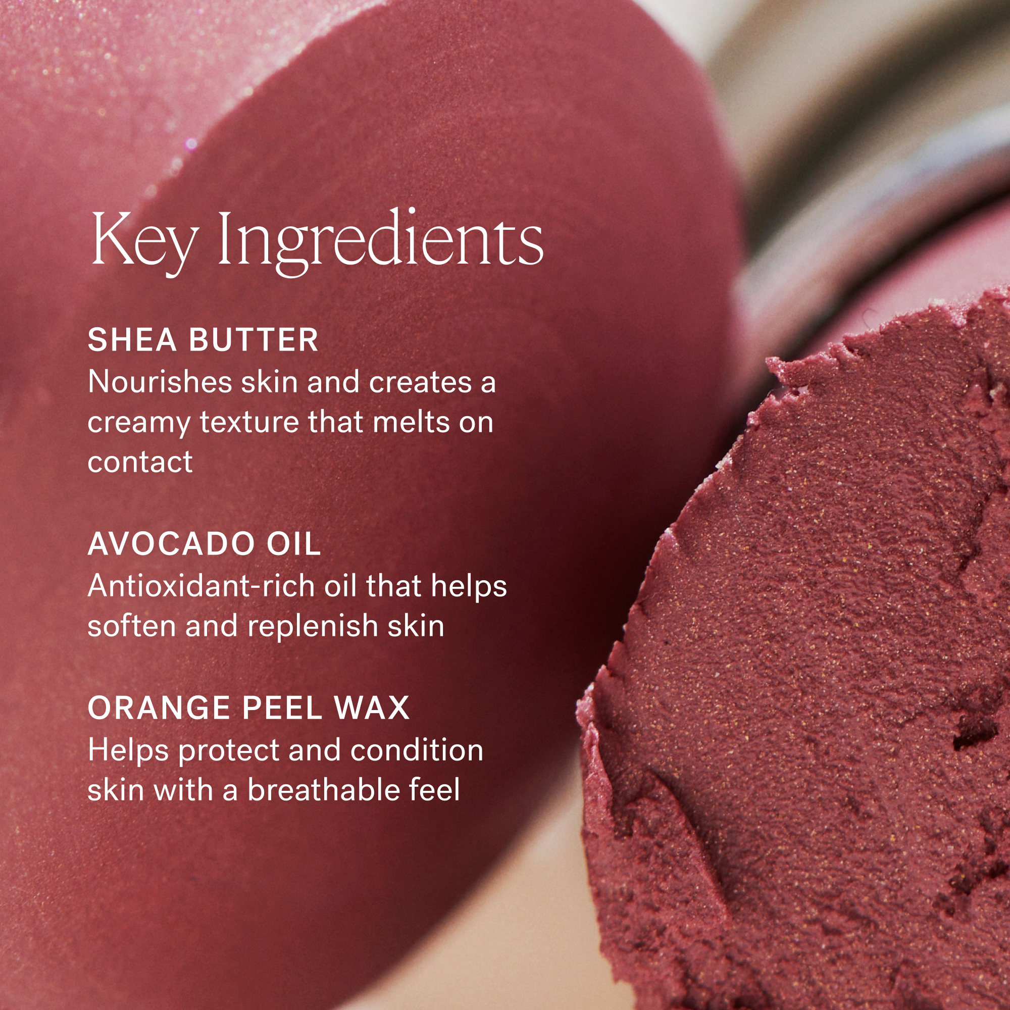 • Avocado Oil - Antioxidant-rich oil that helps soften and replenish skin
