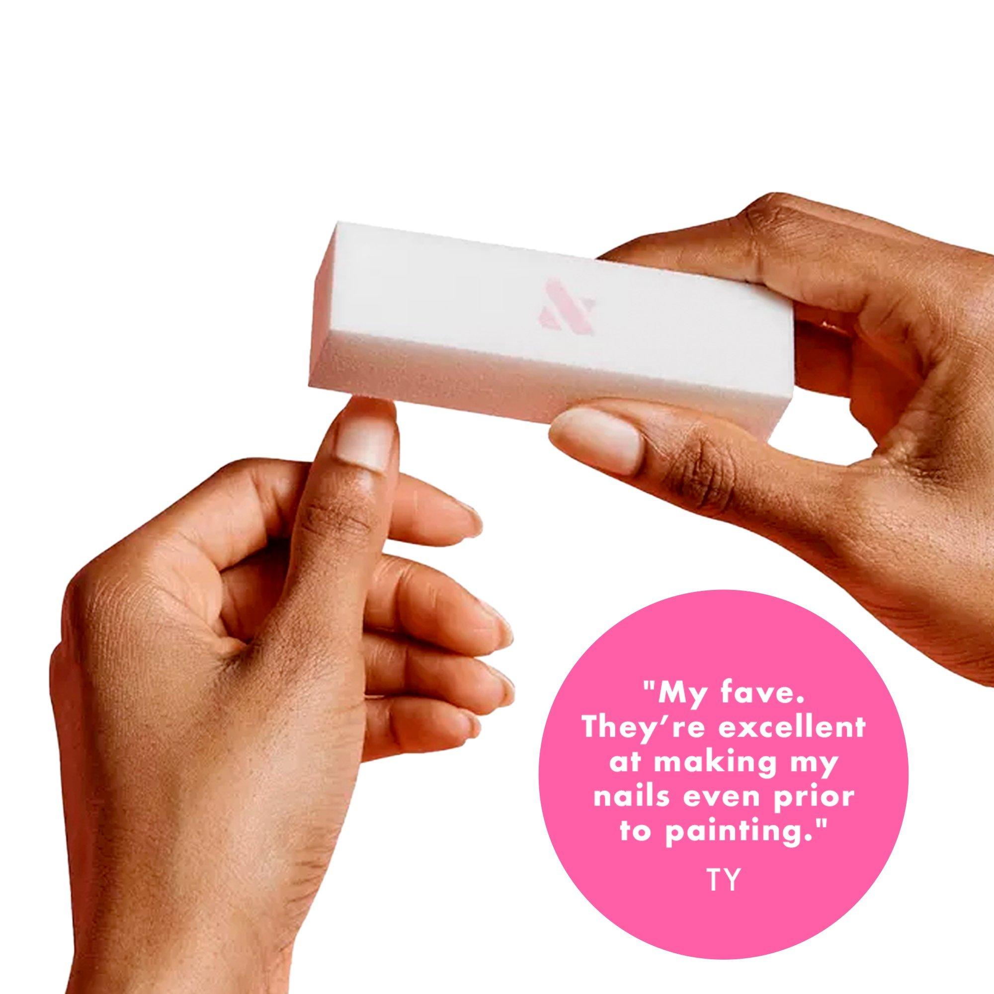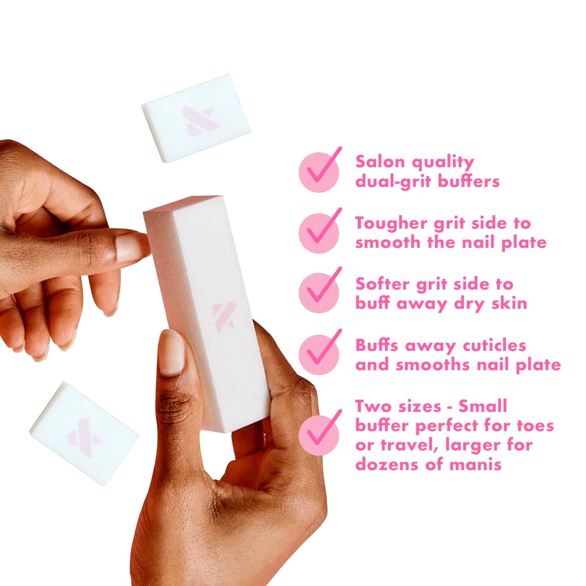 Salon-quality buffers for pro results at home. The full-size buffer is perfect for buffing away dry skin, cuticles and smoothing nails. The mini buffers are the ideal size for the tiny corners of your nails, especially for toes.