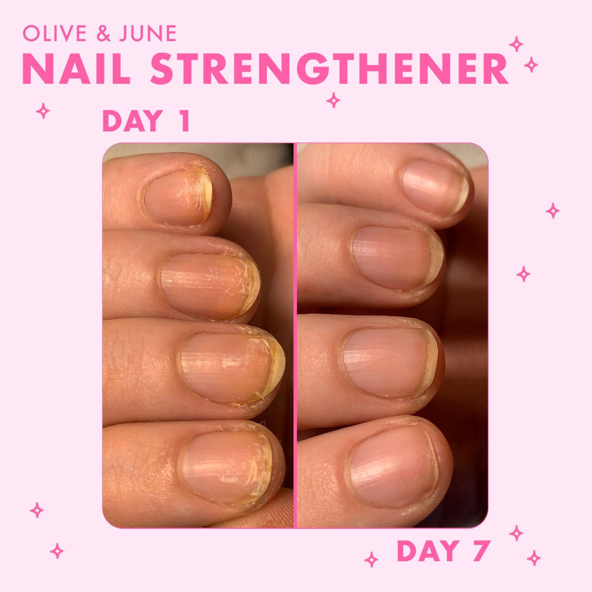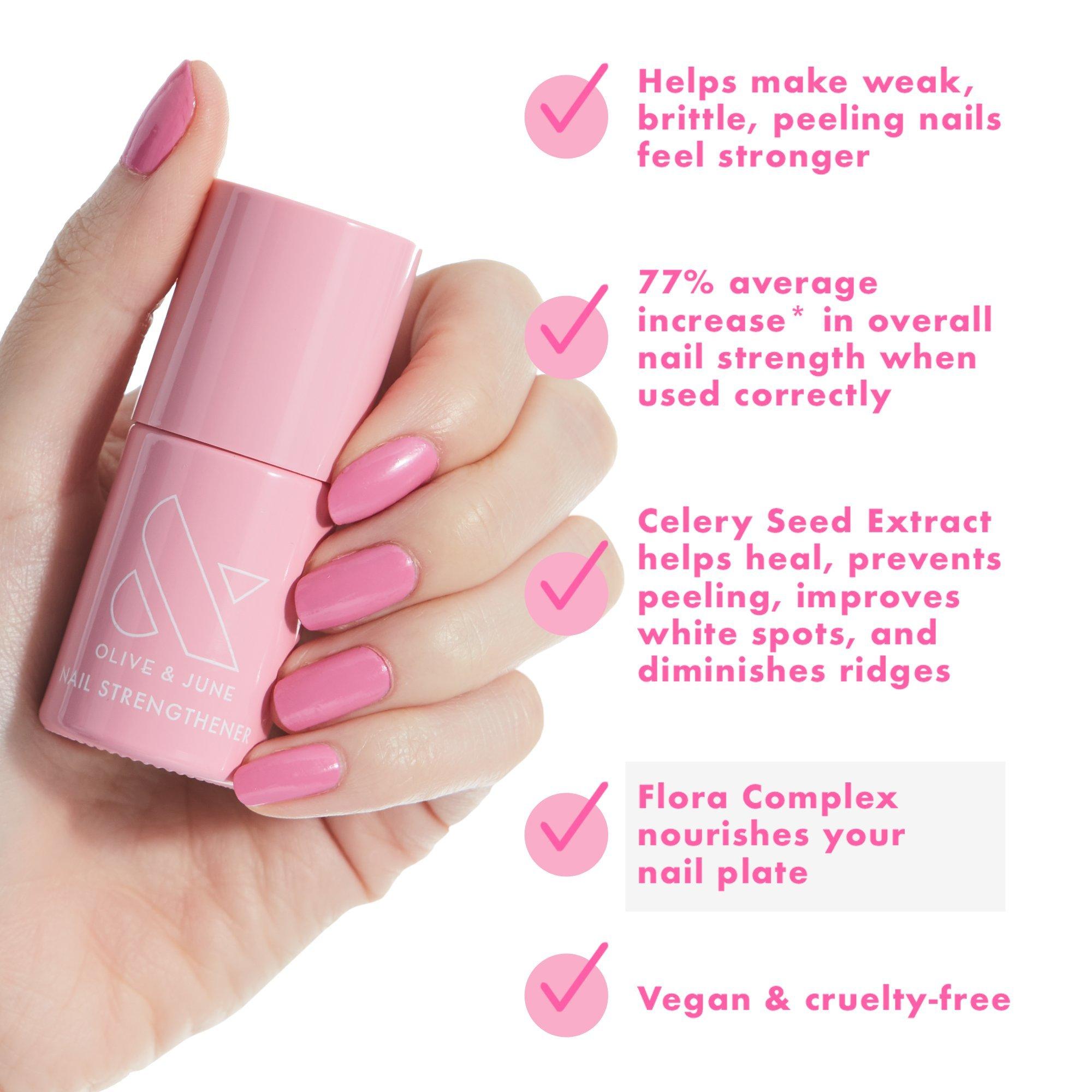 Give your nails a boost. A bonus step for nail prep, this Olive & June Nail Strengthener formula increases nail strength by 77%, resulting in stronger nails with improved durability & a decrease in white spots. Increases durability by nearly 20% so your manicure lasts 2-3 days longer than average.