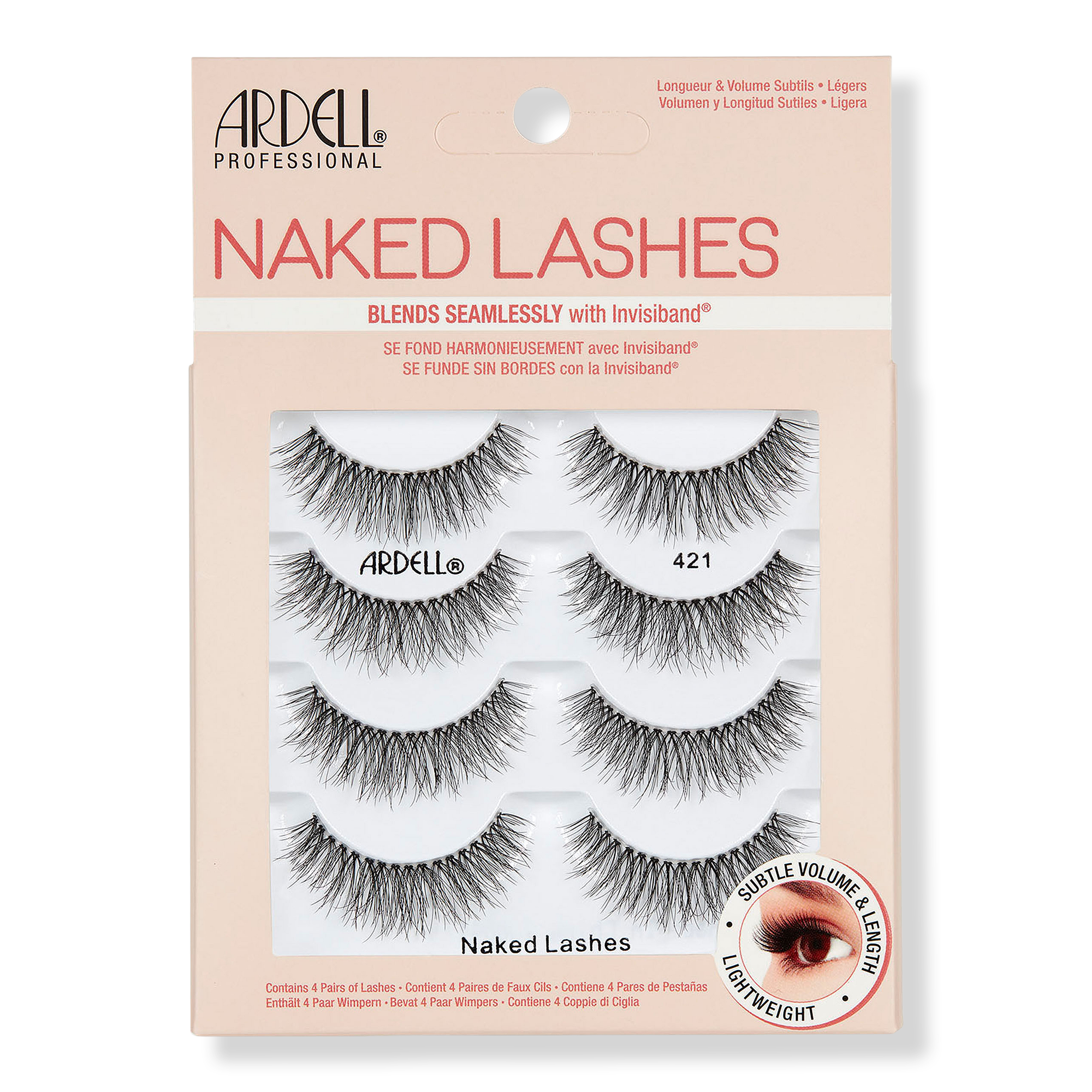 Ardell's Naked Lashes have subtle volume & length for everyday wear. Naked Lash #421 - 4 Pack has mid-length and volume with crisscross layering.
