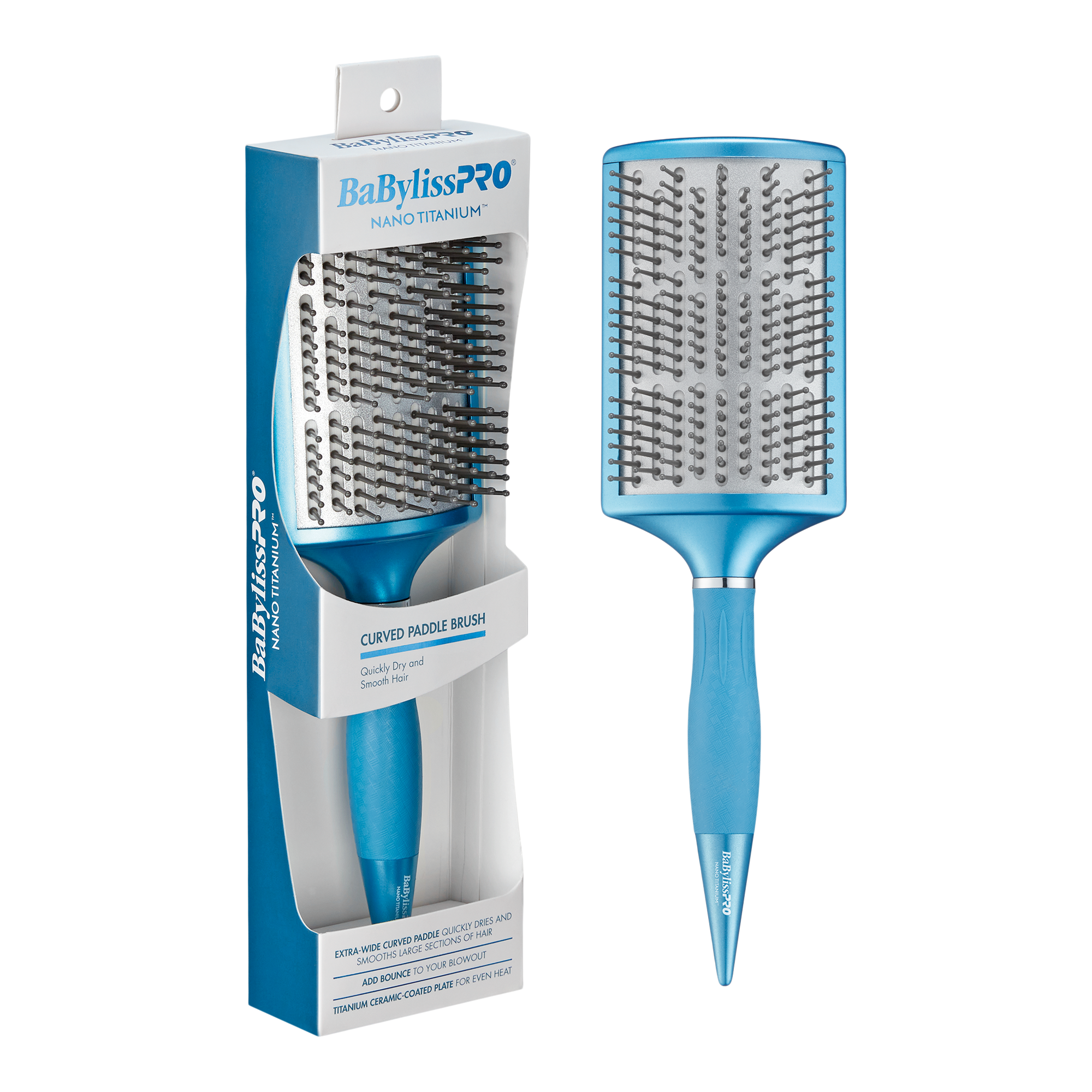 Ideal for fast full-bodied blowouts, the BaBylissPRO® Nano TitaniumTM Curved Paddle Brush is designed to quickly dry and smooth large sections of hair.