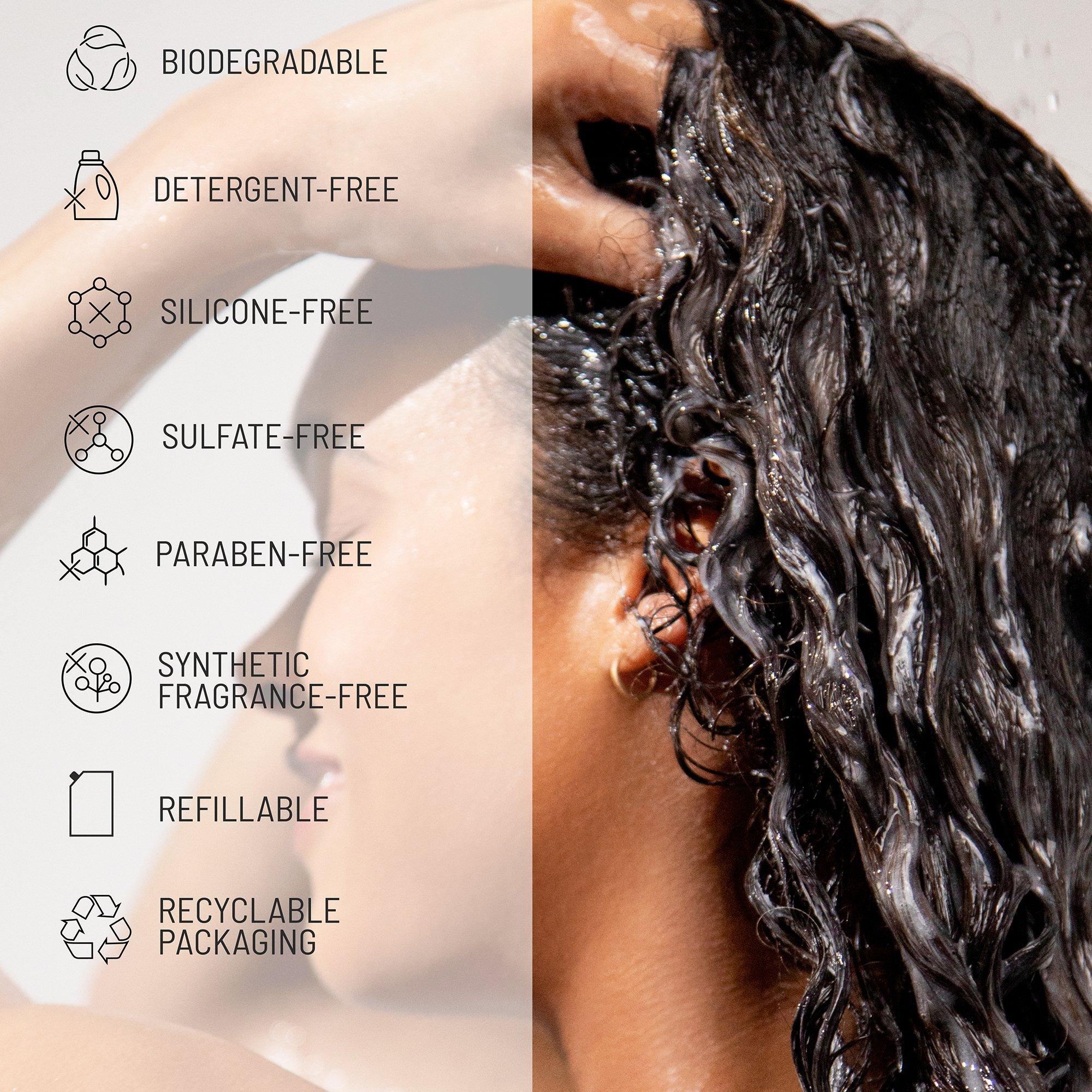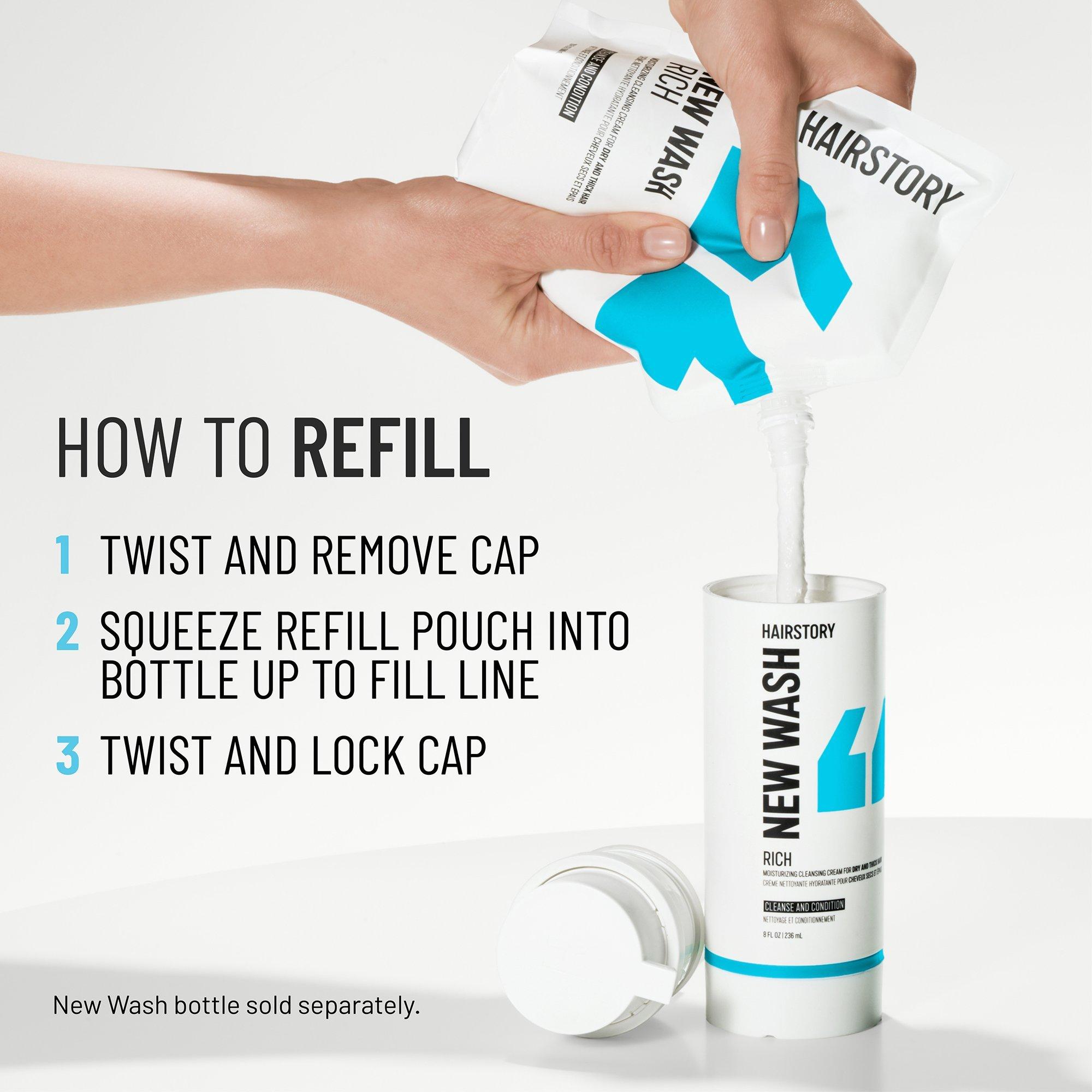 Hairstory New Wash Rich cleans like a shampoo, deeply moisturizes like a conditioner and nourishes like a mask - in one simple step. Replace your damaging wash-grease-repeat routine with detergent-free New Wash to protect your natural oils, revealing a healthier scalp and softer, smoother hair.