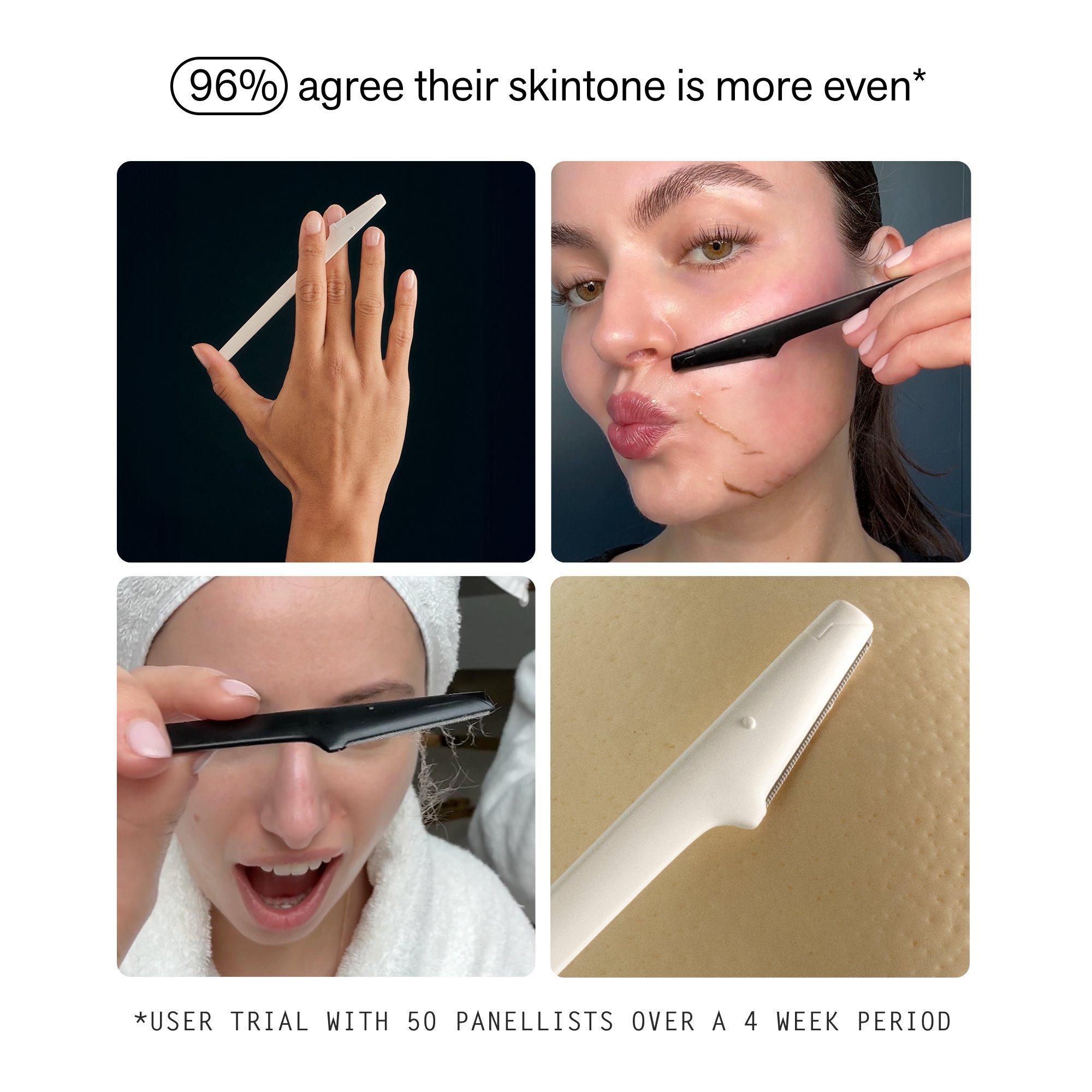 Apply facial oil to clean, dry skin. Lightly pat down evenly over cheeks, chin, forehead, eyebrows, nose and upper lip. Angle the dermaplane blade at a 45 degrees to the skin, hold skin taut. Dermaplane in the direction of the hair growth in short strokes. Use a cotton pad or rinse blade to remove the debris build-up. Use your skincare as usual. Not recommended for use more than once per week. If you are using retinoids, AHAs, BHAs, or other exfoliating treatments, ensure you apply an SPF after dermaplaning.