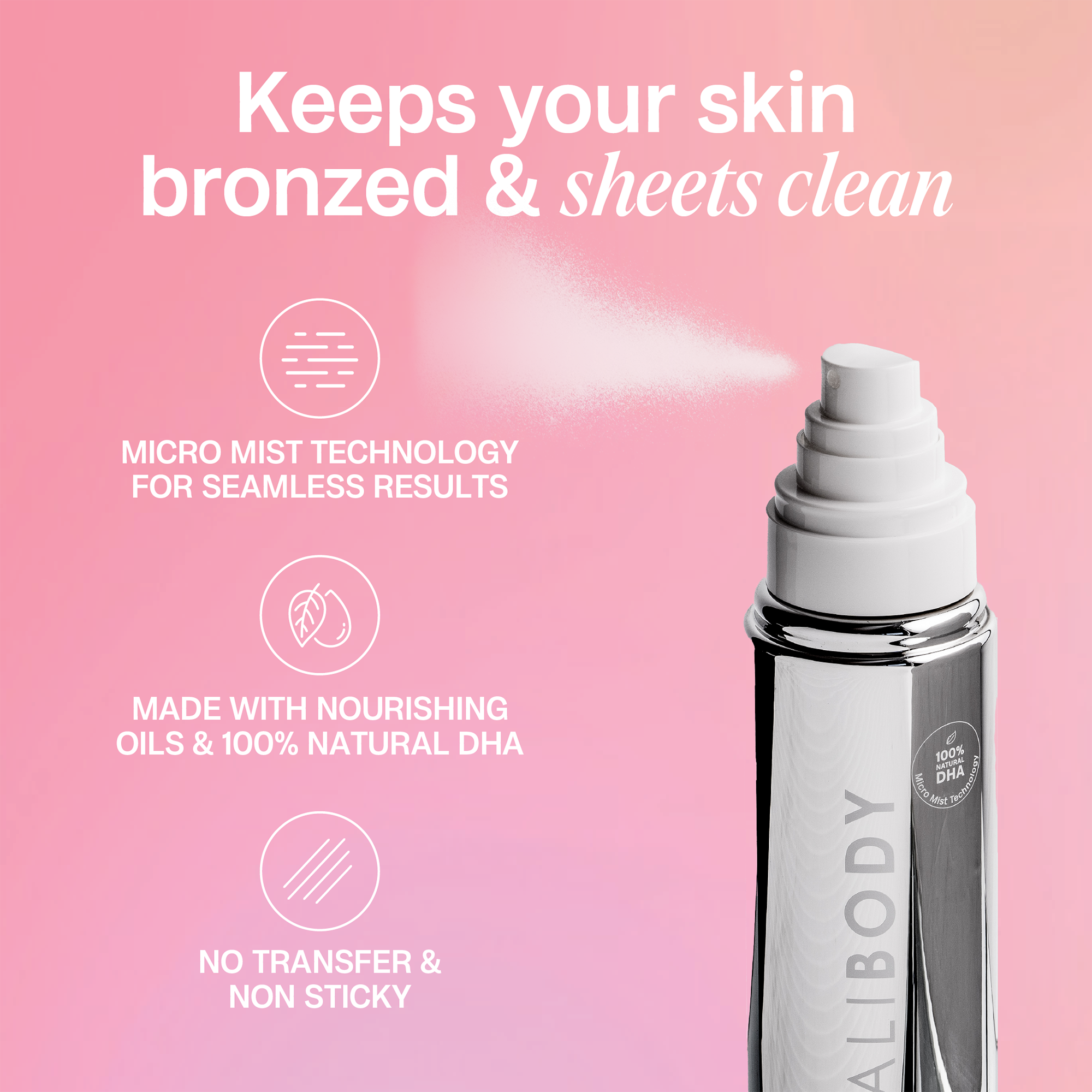 For an even, streak-free tan, exfoliate prior to application. Spray the Self Tan Mist liberally to saturate skin and then blend in using a tanning mitt or body blending brush.