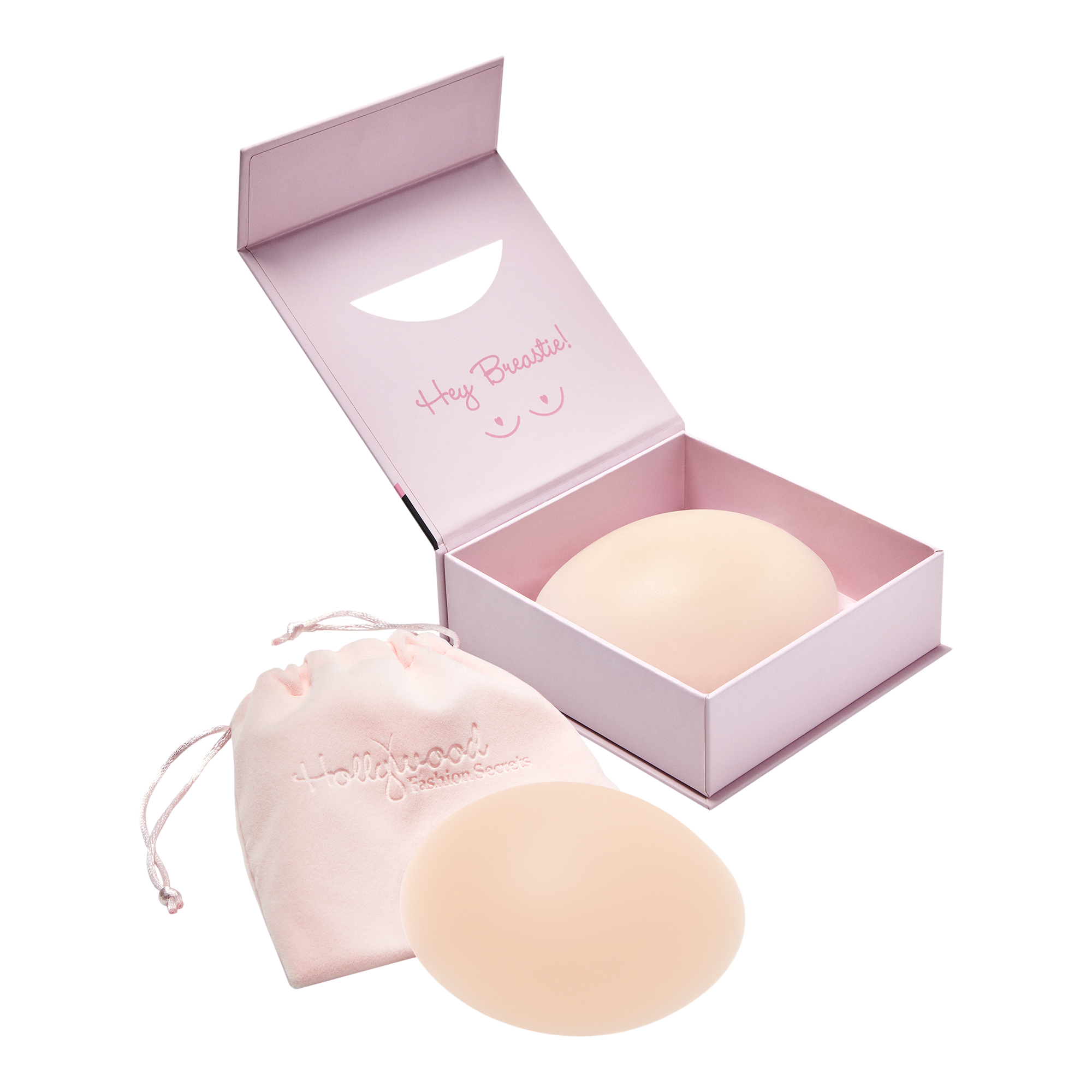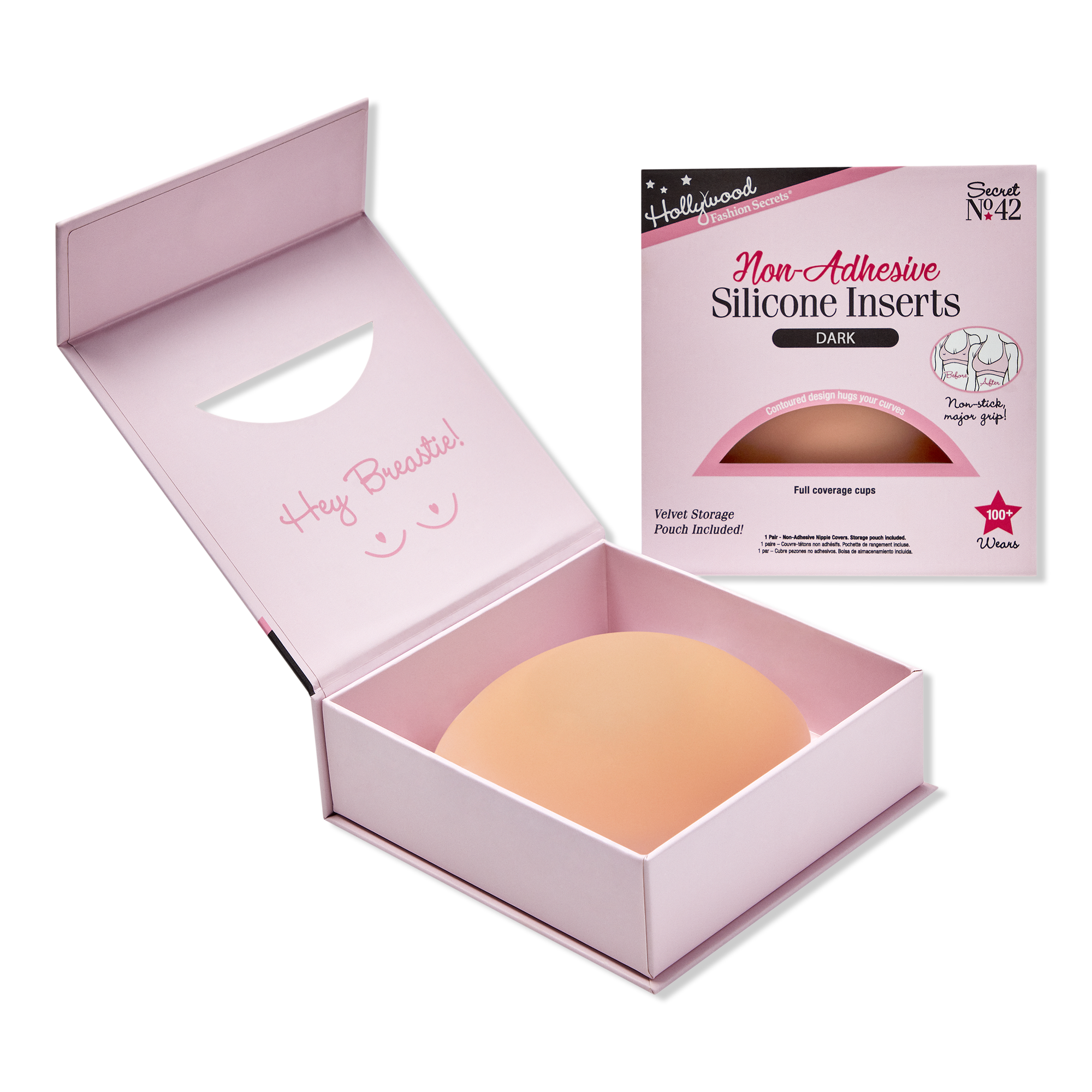 TO USE. . . Peel away from the protective backing on the Non-Adhesive Silicone Inserts. On clean, dry, oil/lotion-free skin, position the Silicone Inserts on your breast and hold into place for a few seconds as body heat will help keep Silicone Inserts in place. If your body naturally runs cool, lightly dampen wet the Silicone Inserts, place on the center of your breast and hold for 10 seconds. Use the contoured backing to place your Silicone Inserts back on and in the velvet pouch for storage and travel.