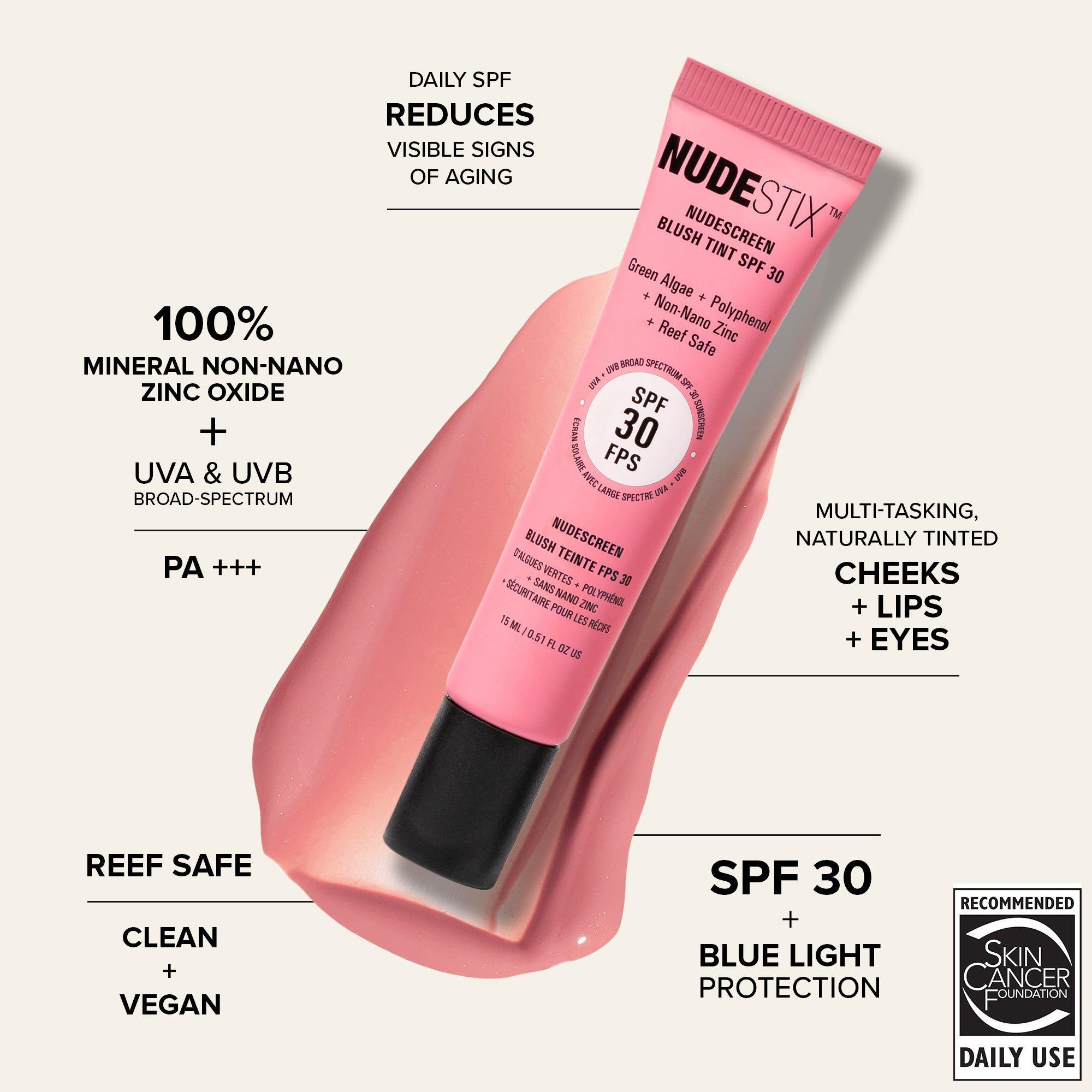 NUDESTIX Nudescreen Blush Tint SPF 30 multi-tasks as a clean, naturally tinted liquid blush color for cheeks, lips and eyes that is lightweight and hydrating