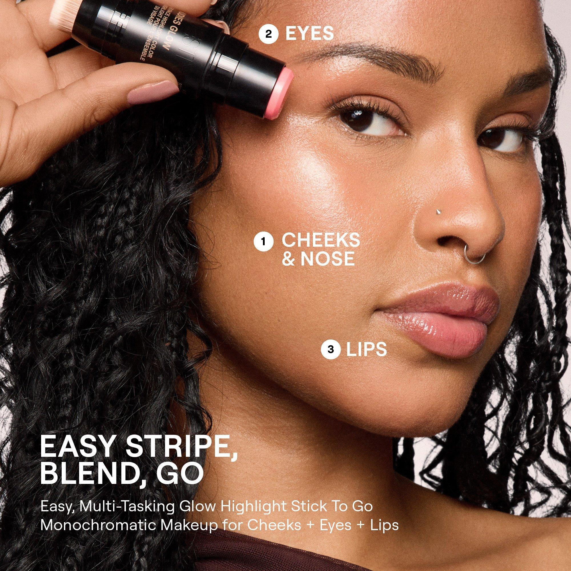 Over Makeup: Swipe brush from stick using a brush or fingers then pat product onto highpoints of the face, inner eye corners and cupid's bow.