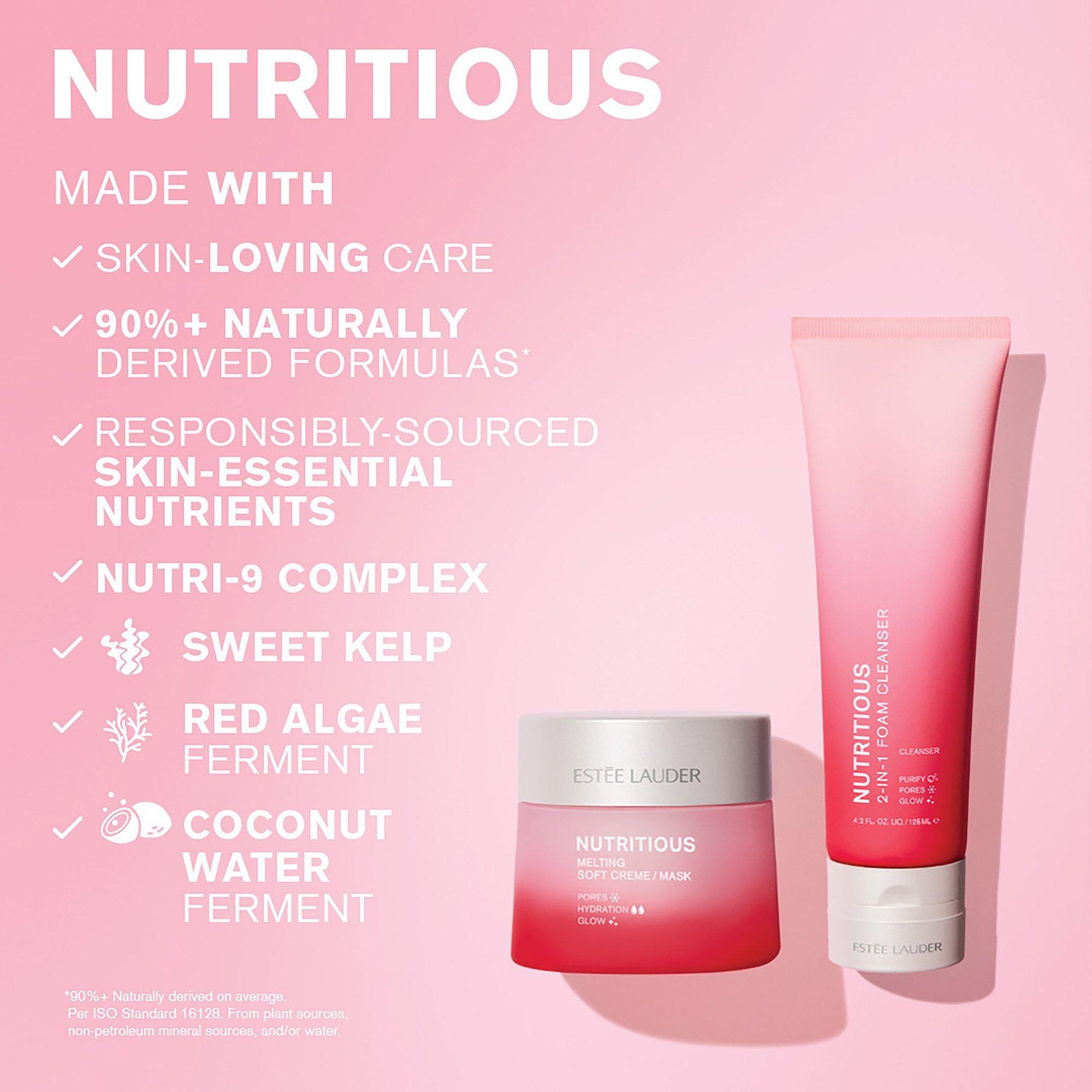 Estée Lauder's Nutritious 2-in-1 Foam Cleanser is a daily cleanser plus a weekly purifying mask to show your skin some love. A nutrient-rich daily cleanser that doubles as a weekly purifying mask, Nutritious 2-in-1 Foam Cleanser removes excess oil and impurities while minimizing the look of pores.