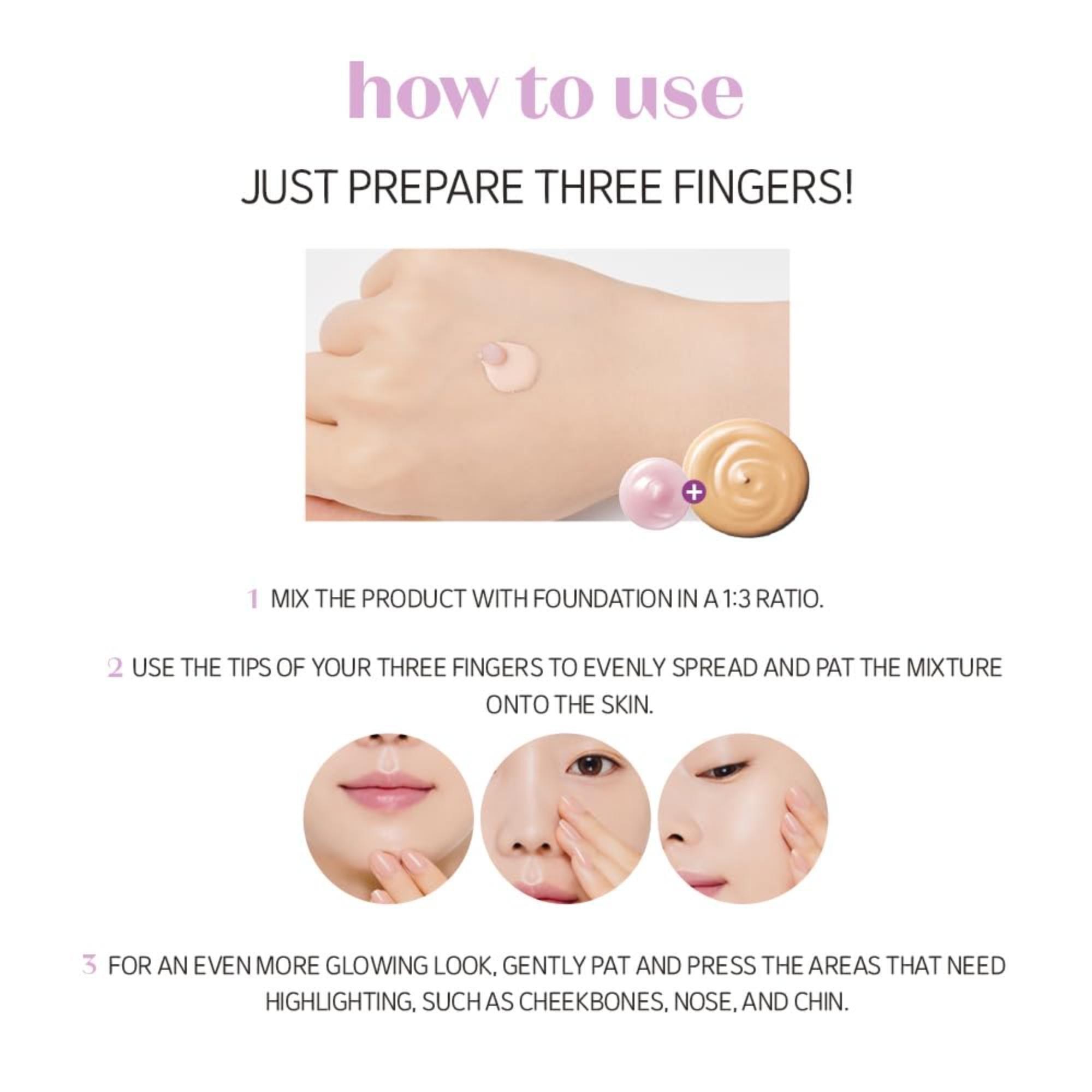 Mix the product with foundation at a 1:3 ratio for a radiant base.