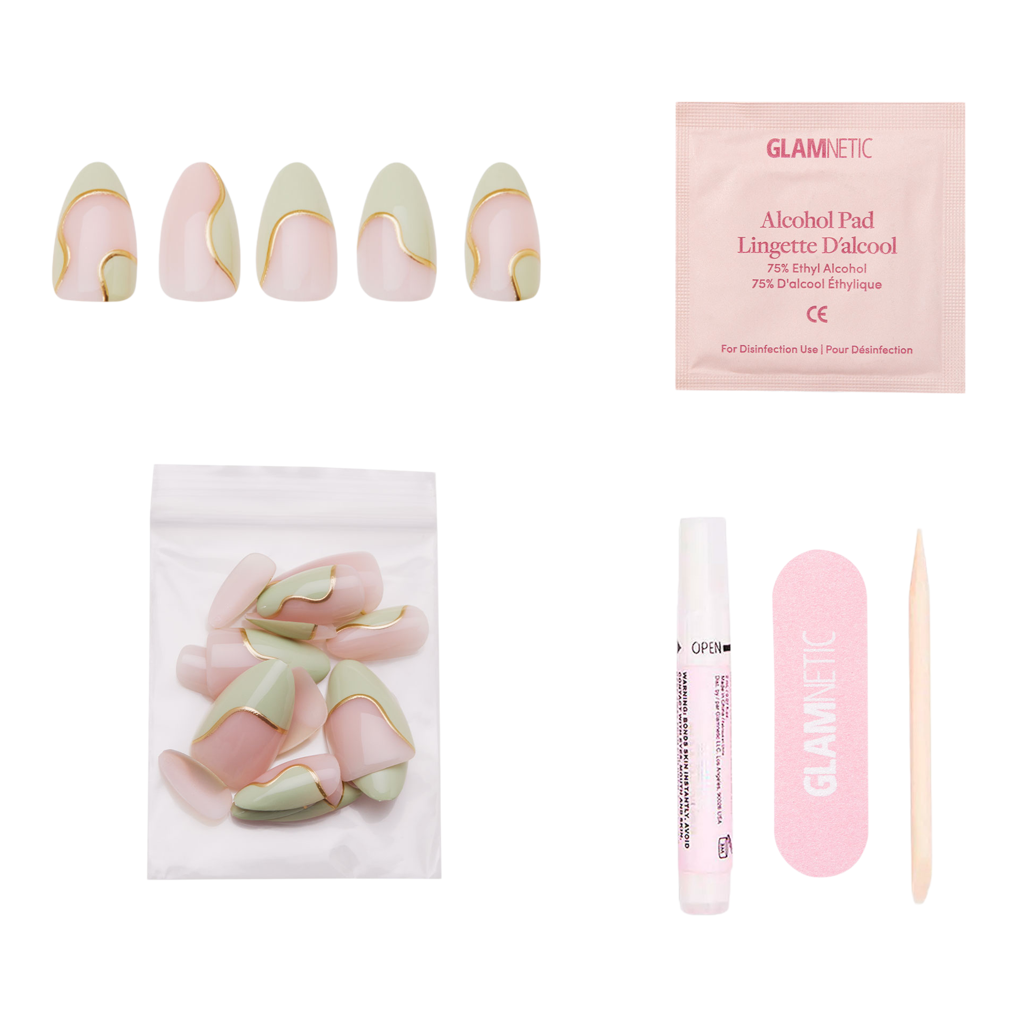 Remove any previously applied nail polish. Wash and dry hands. Gently push back cuticles using the cuticle stick and sanitize nails with alcohol pads. Size Glamnetic nails by placing on finger and select sizes best suited for your natural nails. Apply an even layer of glue to natural nails and the back of Glamnetic nails. Align Glamnetic nails with cuticle line and apply at a downward angle. Press down firmly and hold for 10-20 seconds. Apply all 10 nails and if needed, file or clip to achieve desired shape.
