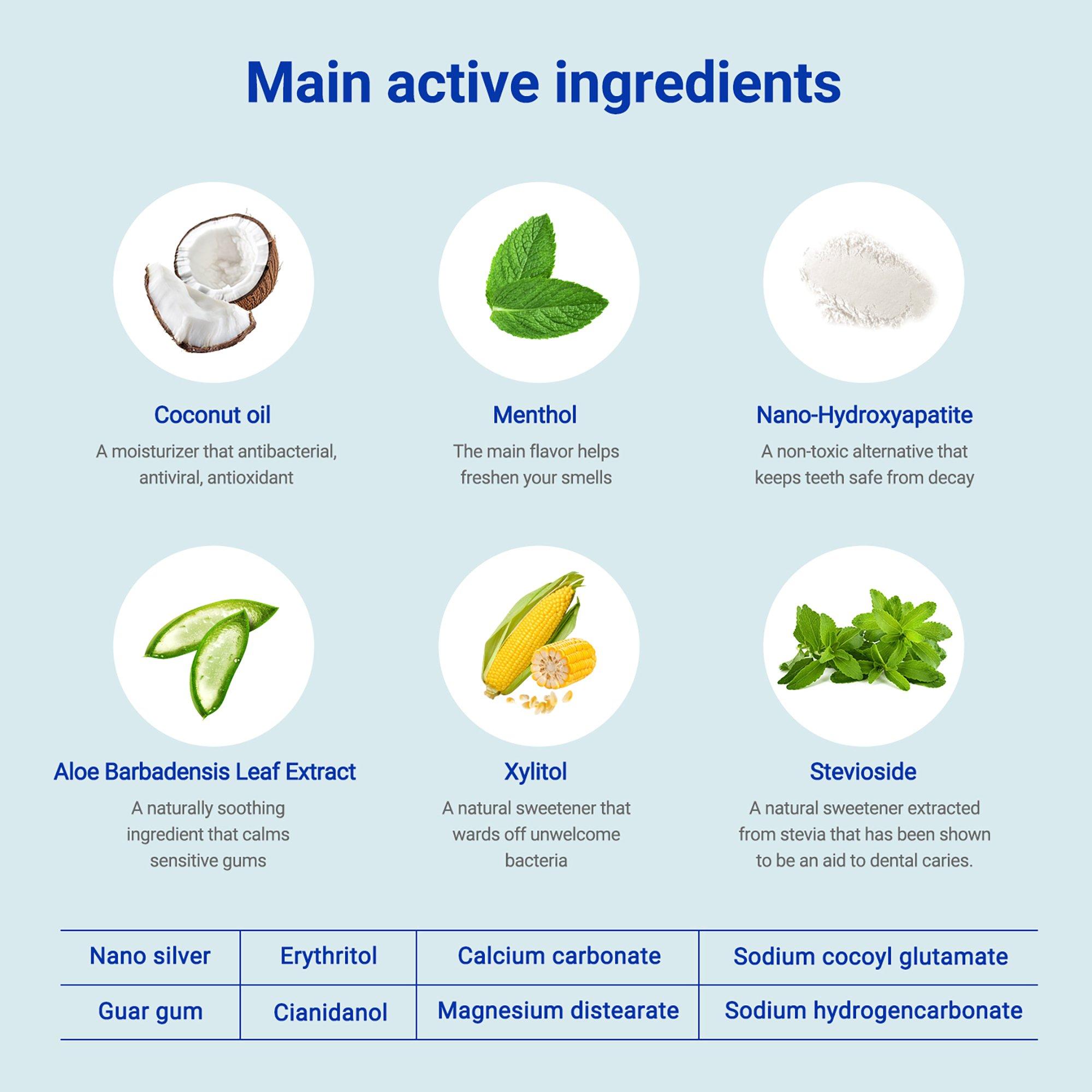 MySmile toothpaste tablets use coconut oil, Aloe Barbadensis Leaf Extract, menthol, and nano-hydroxyapatite to whiten, fight sensitivity, and support enamel. Vegan, fluoride-free, and cruelty-free, they’re perfect for travel with a simple chew, swish, spit, and smile routine.