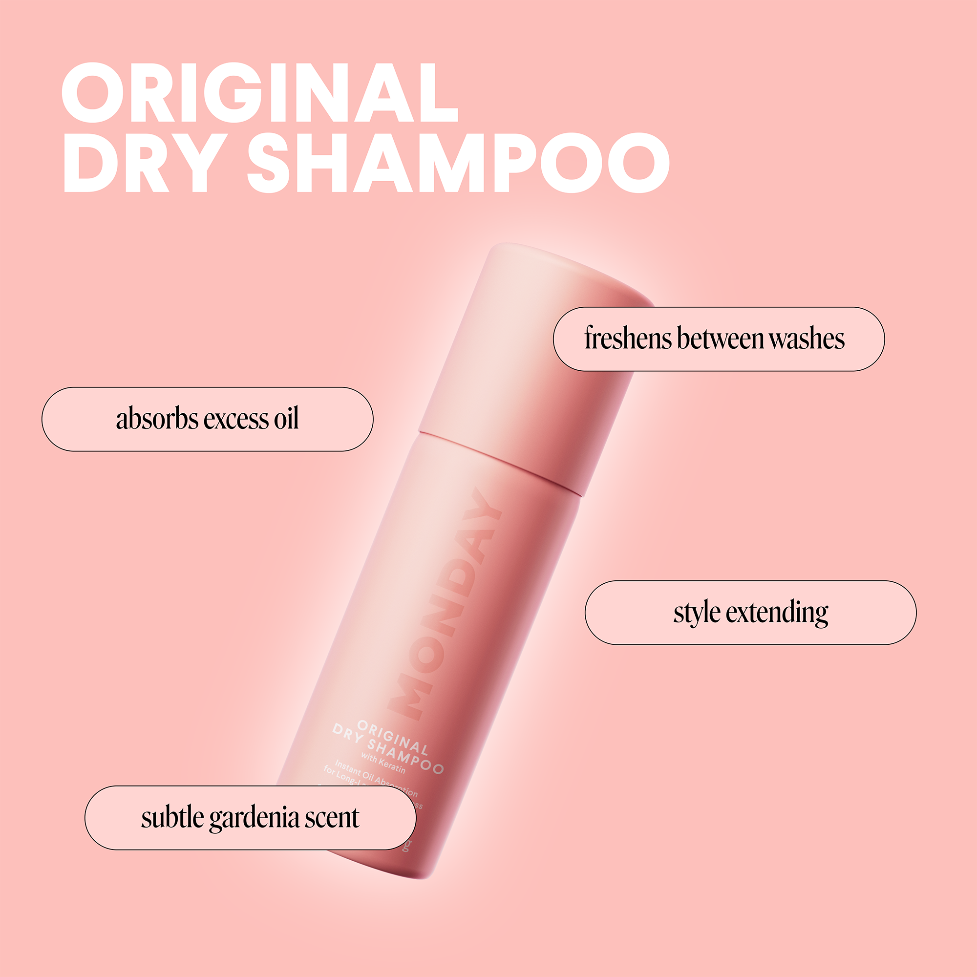 Wish you could make that just-washed feeling last longer? With a subtle gardenia scent, MONDAY Haircare's ORIGINAL Dry Shampoo absorbs excess oil to freshen hair between washes - while nourishing Keratin helps to balance and protect.