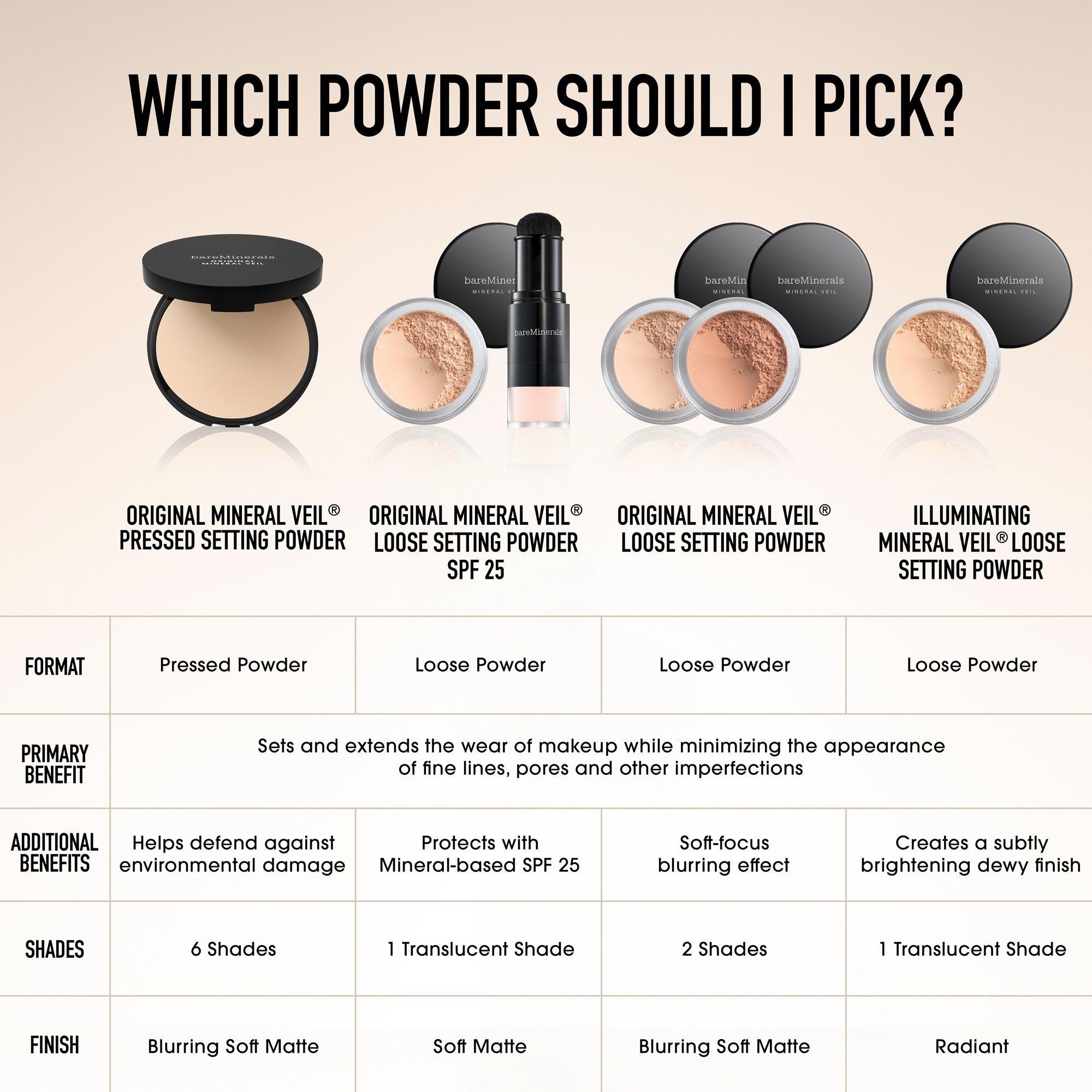 Weightless and talc-free, BareMinerals ORIGINAL Mineral Veil Loose Setting Powder SPF 25 sets and extends makeup wear while blurring the appearance of pores and imperfections. This translucent loose powder has a soft matte finish and protects skin from harmful UVA/UVB rays with mineral-based SPF 25.