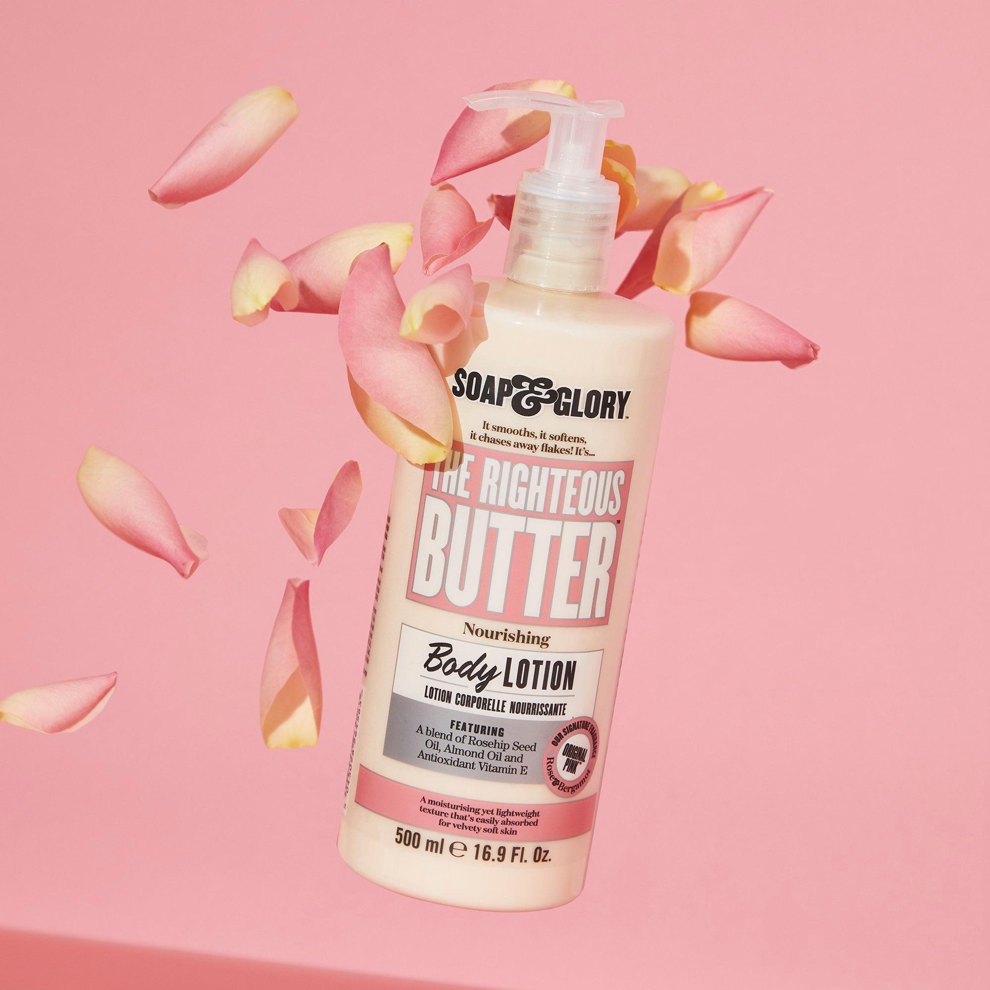 Moisturize, hydrate and feel spectacularly softer skin with Soap & Glory Original Pink The Righteous Butter Moisturizing Body Lotion. This lightweight, non-greasy lotion has nourishing ingredients that lock in moisture, and it smells like a dream with the iconic Soap & Glory Original Pink fragrance.