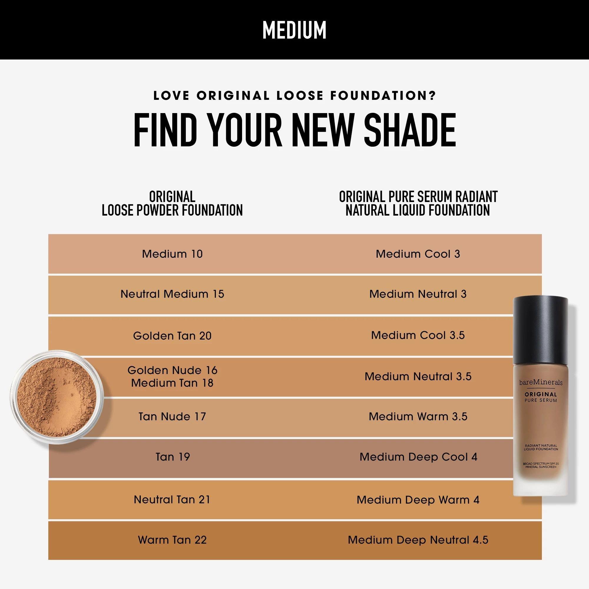 bareMinerals Original Pure Serum Radiant Natural Liquid Foundation Mineral SPF 20 is 93% skincare-infused and made with only 23 ingredients. This foundation is silicone-free, fragrance-free, chemical screen-free, and oil-free. Now in 30 shades.
