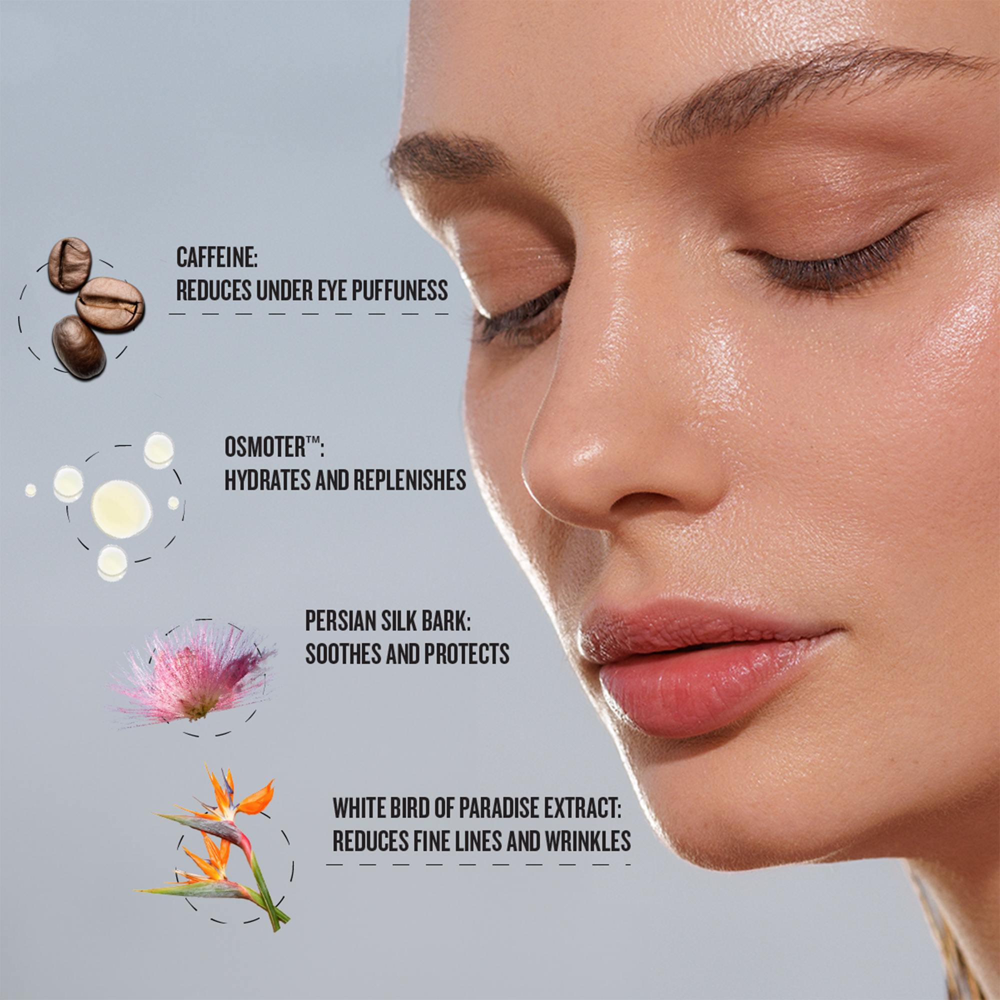 • Reduces the appearance of dark circles and puffiness