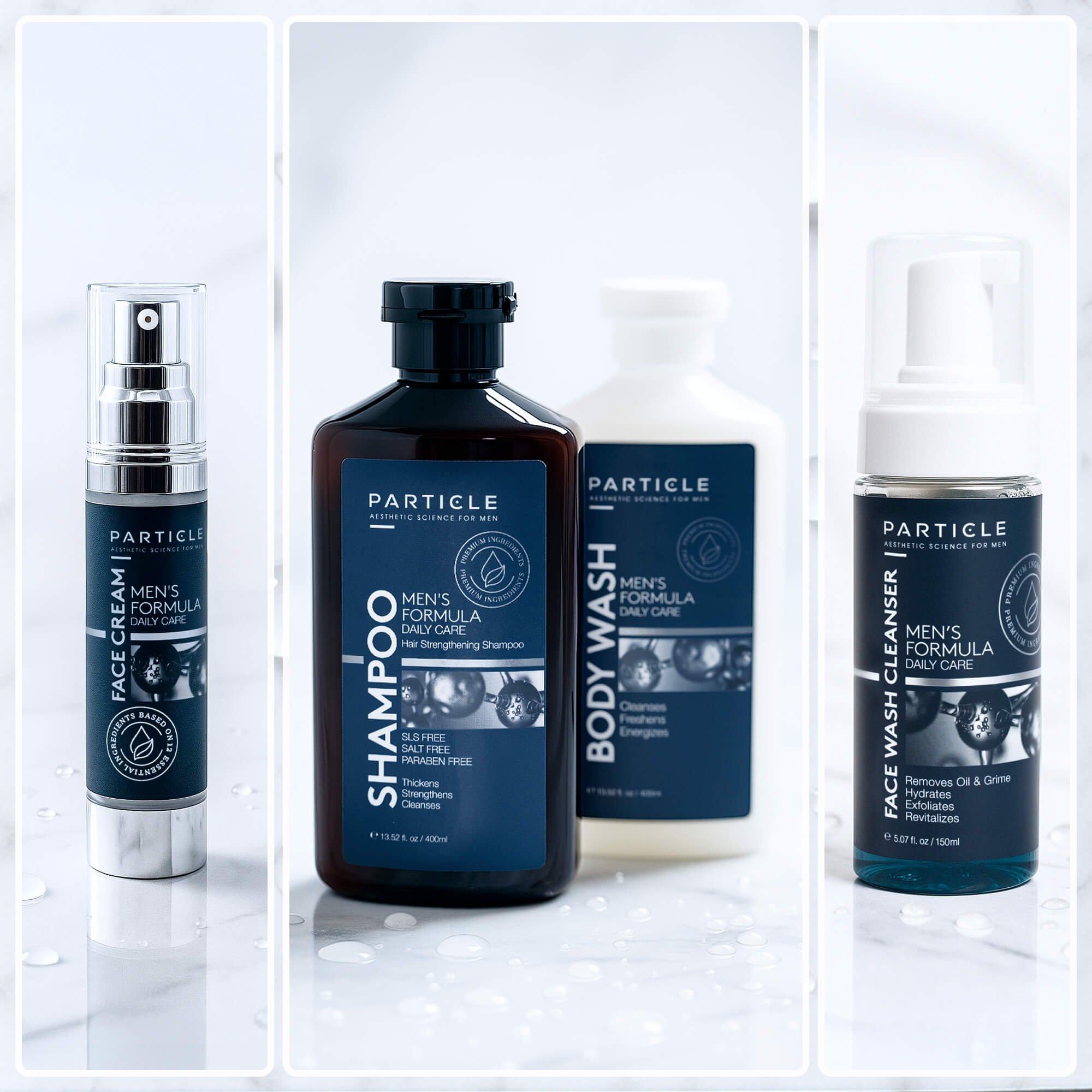 The ultimate men’s gift bundle. Includes Particle’s Face Cream to moisturize and rejuvenate, Face Wash to cleanse and energize, Shampoo to strengthen hair and scalp, and Body Wash to refresh. Complete care for looking and feeling your best.