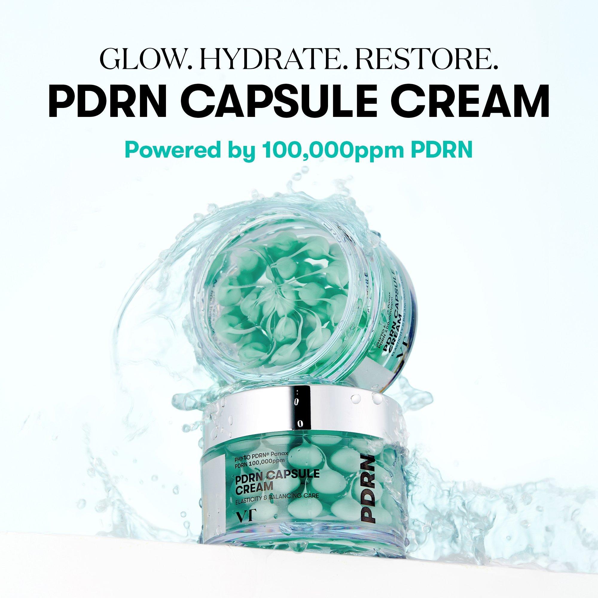 VT Cosmetics PDRN Capsule Cream 100 combines a hydrating gel with wild ginseng–derived PDRN capsules, helping to balance oil and moisture, support elasticity, and reveal dual radiance through hydration and nourishment.