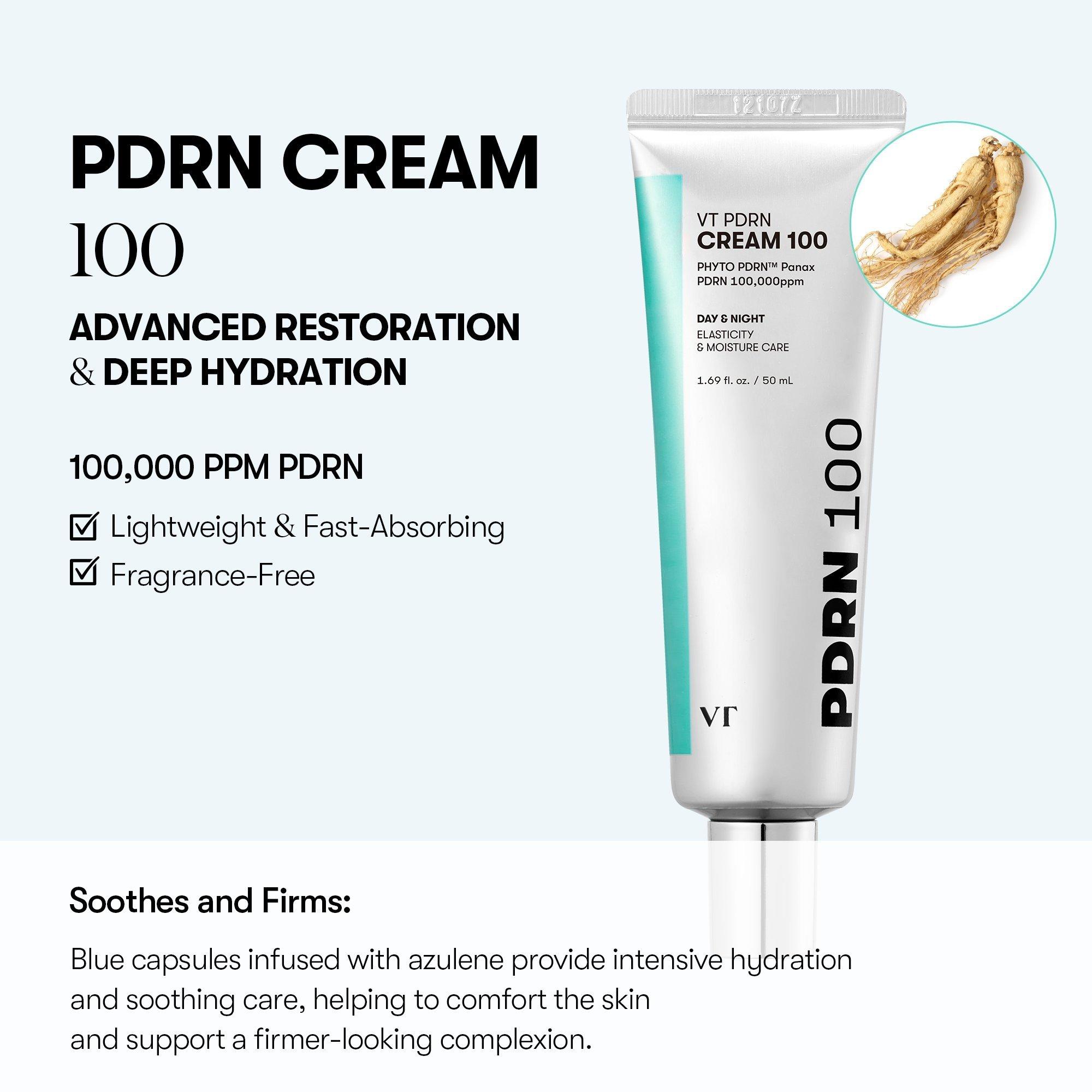 VT Cosmetics PDRN Cream 100 hydrates and nourishes with 100,000 ppm of PHYTO PDRN Panax, made with extract from wild ginseng, while azulene capsules deliver a soothing touch. The rich formula supports skin elasticity and helps promote a radiant, glass-like glow with revitalizing care.