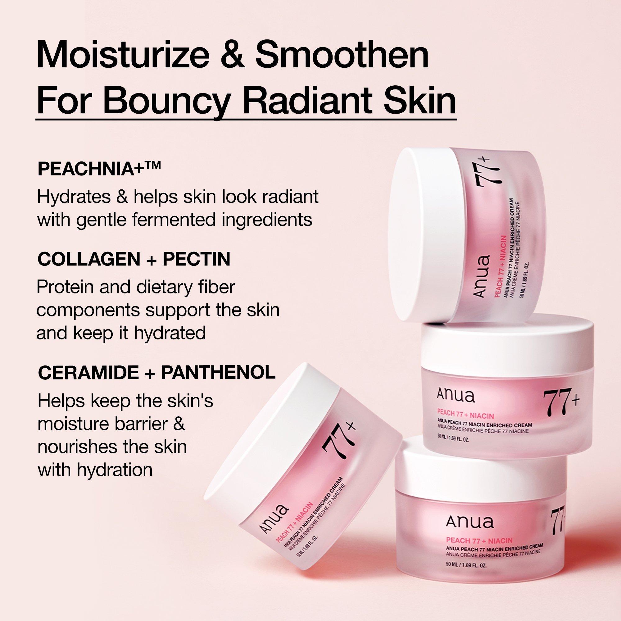 Anua Peach 77 Niacin Enriched Cream infused with PEACHNIA+, Niacinamide, Collagen and Ceramides moisturizes and smoothens for bouncy radiant skin.