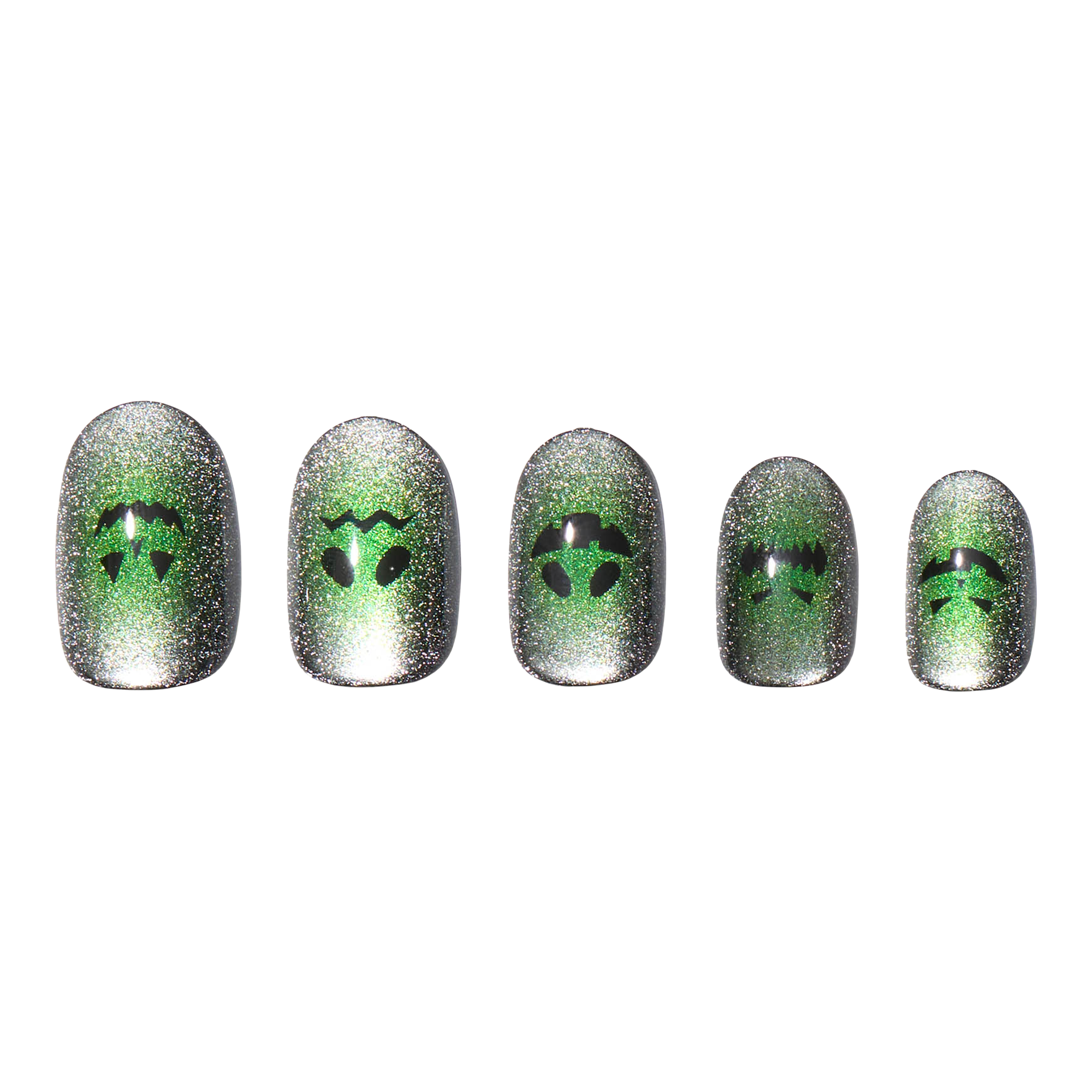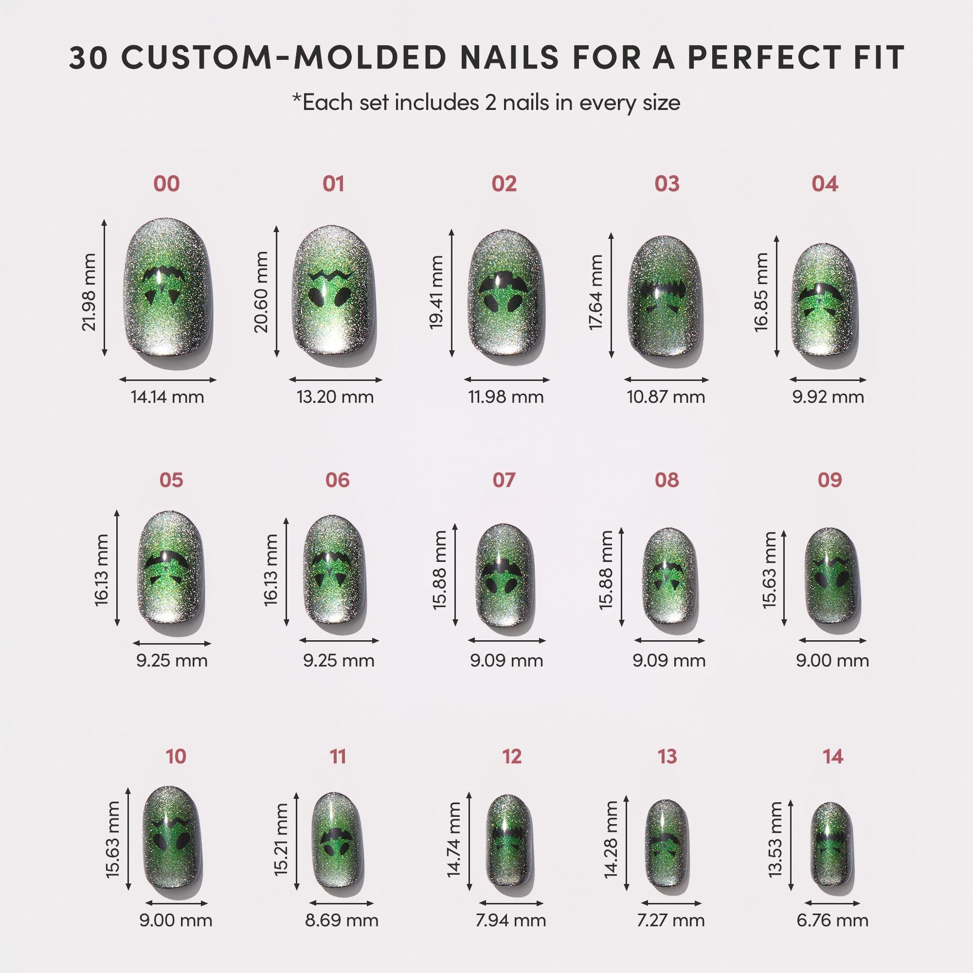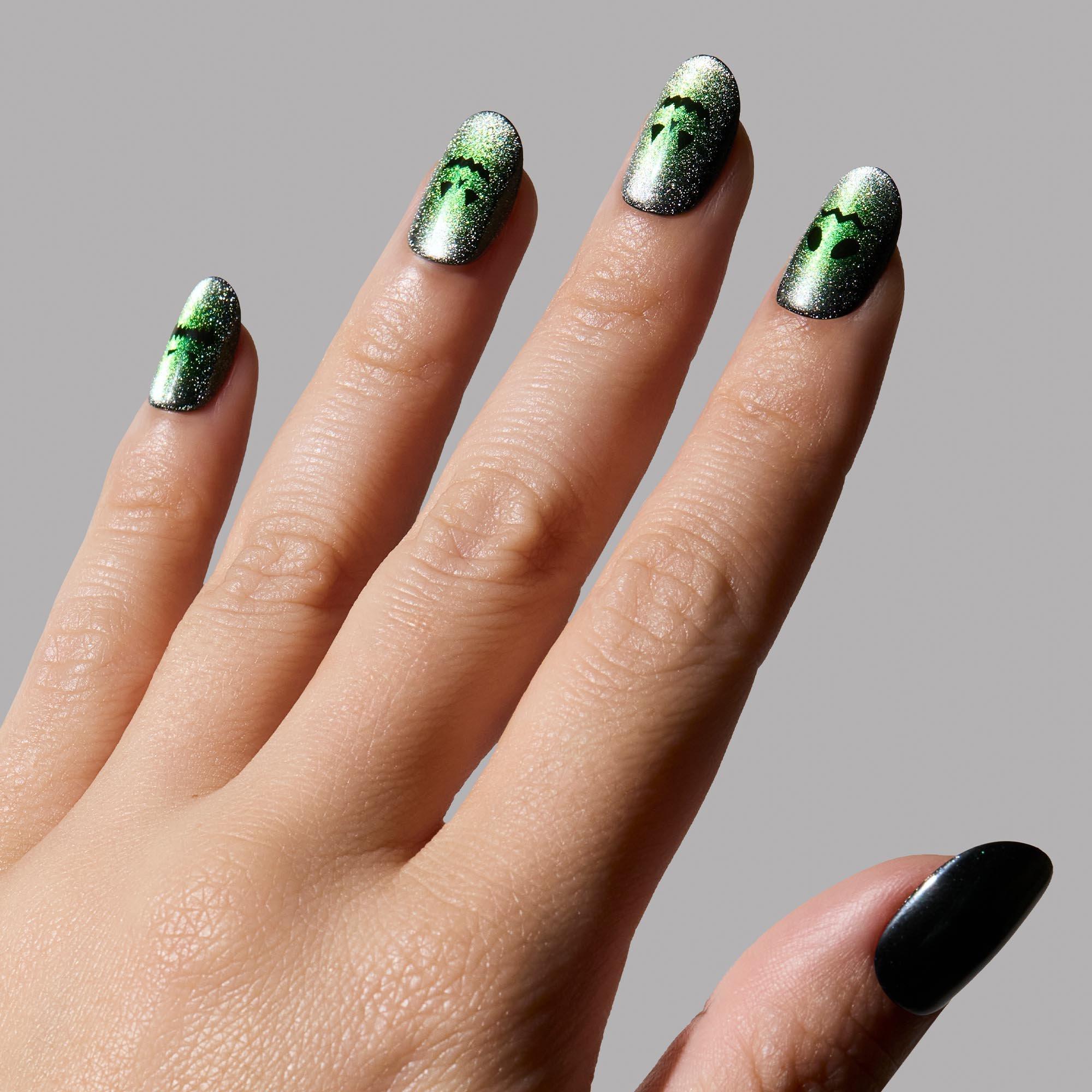 Glamnetic’s Peek-o’-Lantern Press-On Nail Set casts a ghoulish green glow with a magnetic powder effect and eerie silver velvet finish. Each short round nail features a different jack-o’-lantern expression — from sinister smirks to sad frowns. Apply in 10 minutes for up to 2 weeks of screams.