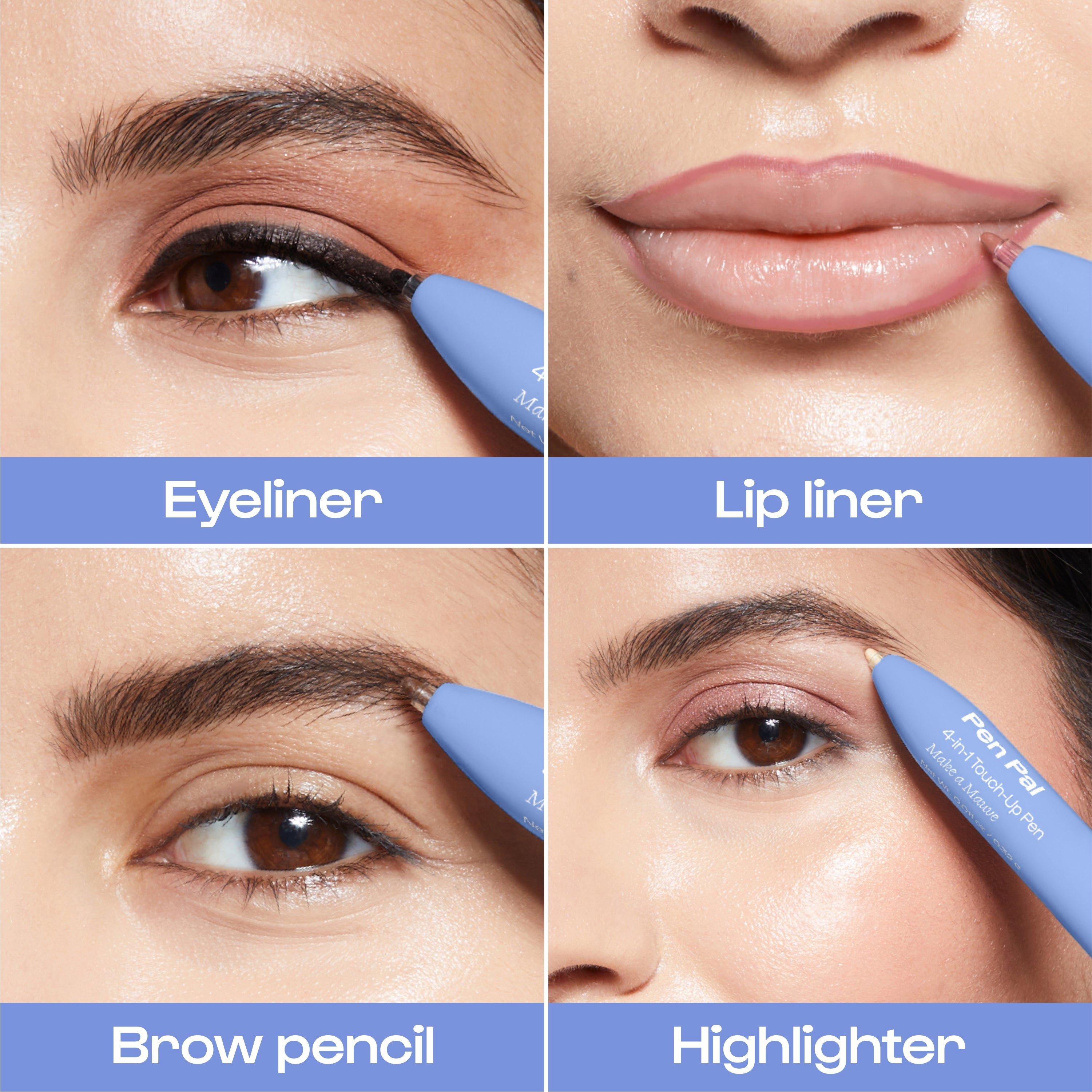 Create almost any look with one nostalgia-inducing makeup pen. Four essentials in one: eyeliner, lip liner, brow pencil, and highlighter. Smooth, vegan, tug-free formulas deliver vivid, blendable color. Handy click pen is pocket-sized, travel-friendly, and always ready to go.
